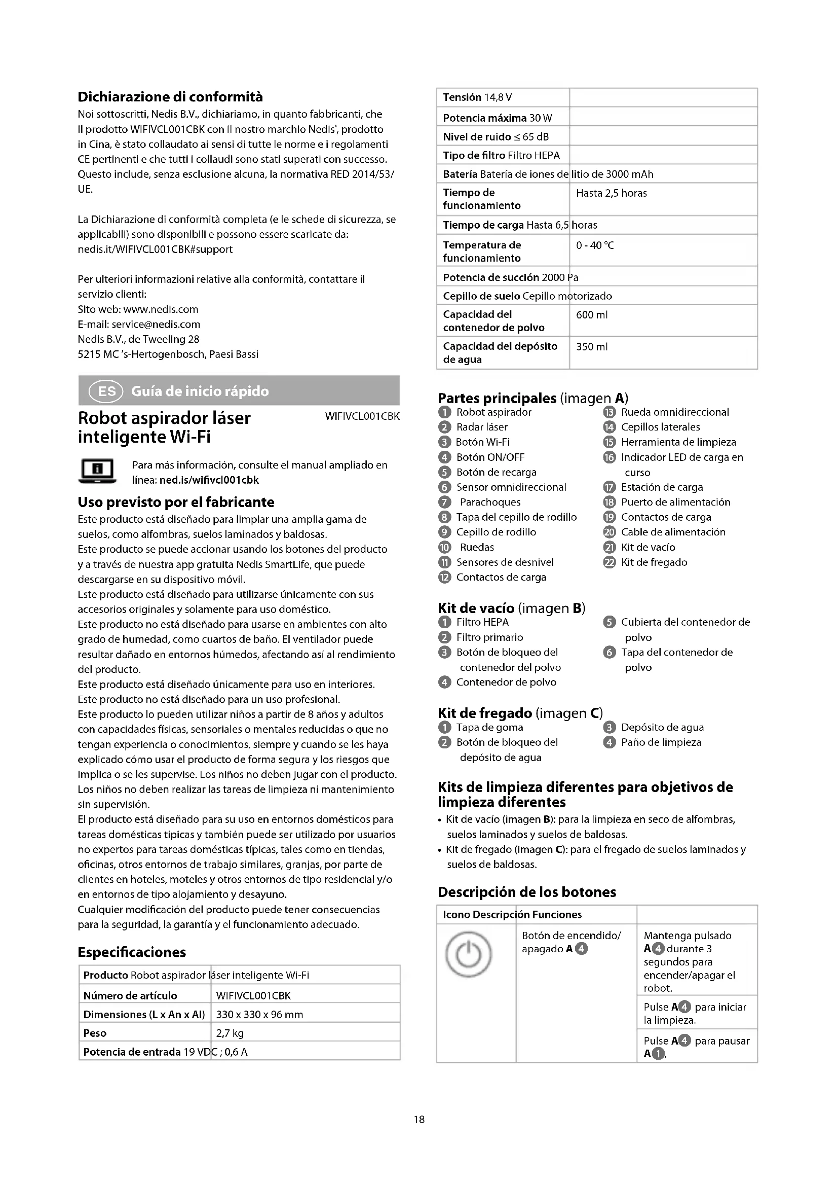 Guía de inicio rápido Robot aspirador láser inteligente Wi-Fi WIFIVCL001CBK Para más información, consulte el manual ampliado en línea: ned.is/wivcl001cbk Uso previsto por el fabricante Este producto está diseñado para limpiar una amplia gama de suelos, como alfombras, suelos laminados y baldosas. Este producto se puede accionar usando los botones del producto y a través de nuestra app gratuita Nedis SmartLife, que puede descargarse en su dispositivo móvil. Este producto está diseñado para utilizarse únicamente con sus accesorios originales y solamente para uso doméstico. Este producto no está diseñado para usarse en ambientes con alto grado de humedad, como cuartos de baño. El ventilador puede resultar dañado en entornos húmedos, afectando así al rendimiento del producto. Este producto está diseñado únicamente para uso en interiores. Este producto no está diseñado para un uso profesional. Este producto lo pueden utilizar niños a partir de 8 años y adultos con capacidades físicas, sensoriales o mentales reducidas o que no tengan experiencia o conocimientos, siempre y cuando se les haya explicado cómo usar el producto de forma segura y los riesgos que implica o se les supervise. Los niños no deben jugar con el producto. Los niños no deben realizar las tareas de limpieza ni mantenimiento sin supervisión. El producto está diseñado para su uso en entornos domésticos para tareas domésticas típicas y también puede ser utilizado por usuarios no expertos para tareas domésticas típicas, tales como en tiendas, ocinas, otros entornos de trabajo similares, granjas, por parte de clientes en hoteles, moteles y otros entornos de tipo residencial y/o en entornos de tipo alojamiento y desayuno. Cualquier modicación del producto puede tener consecuencias para la seguridad, la garantía y el funcionamiento adecuado. Especicaciones Producto Robot aspirador láser inteligente Wi-Fi Número de artículo WIFIVCL001CBK Dimensiones (L x An x Al) 330 x 330 x 96 mm Peso 2,7 kg Potencia de entrada 19 VDC ; 0,6 A19