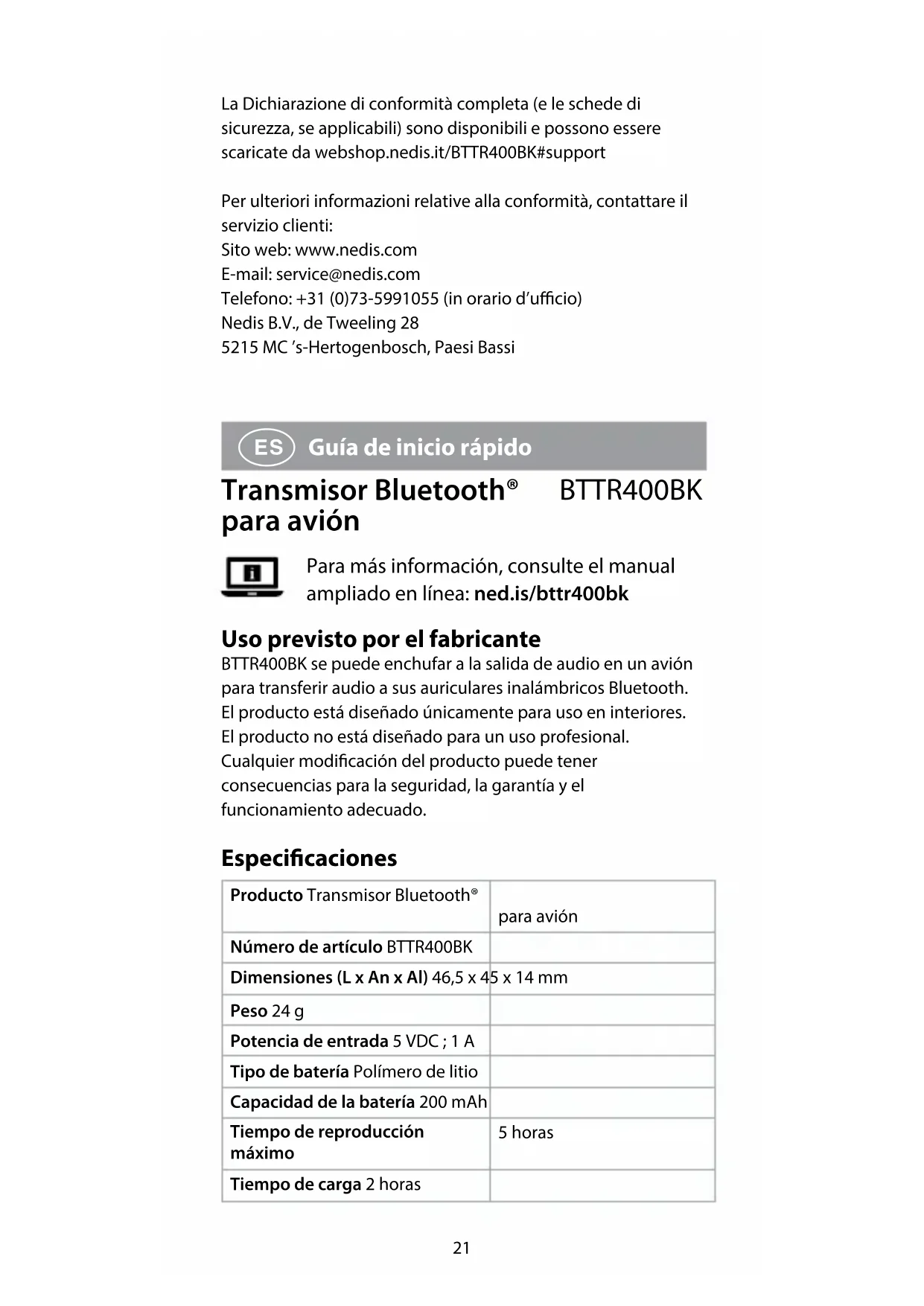 Guía de inicio rápido Transmisor Bluetooth® para avión BTTR400BK Para más información, consulte el manual ampliado en línea: ned.is/bttr400bk Uso previsto por el fabricante BTTR400BK se puede enchufar a la salida de audio en un avión para transferir audio a sus auriculares inalámbricos Bluetooth. El producto está diseñado únicamente para uso en interiores. El producto no está diseñado para un uso profesional. Cualquier modicación del producto puede tener consecuencias para la seguridad, la garantía y el funcionamiento adecuado. Especicaciones Producto Transmisor Bluetooth® para avión Número de artículo BTTR400BK Dimensiones (L x An x Al) 46,5 x 45 x 14 mm Peso 24 g Potencia de entrada 5 VDC ; 1 A Tipo de batería Polímero de litio Capacidad de la batería 200 mAh Tiempo de reproducción máximo 5 horas Tiempo de carga 2 horas22 Tiempo en espera Hasta 200 horas Versión Bluetooth® 4.2 Rango de frecuencia 2402 - 2480 MHz Potencia de transmisión máxima 2 dBm Protocolos compatibles A2DP, AVRCP Conexiones Entrada estéreo de 3,5 mm Entrada mono de 3,5 mm Micro USB Partes principales (imagen A)