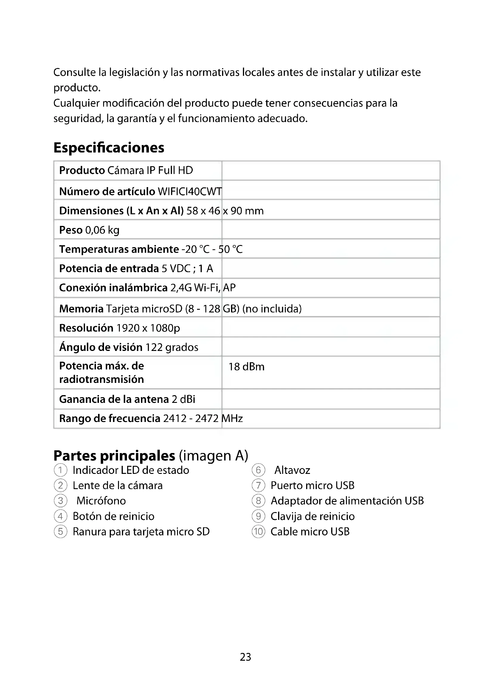 Guía de inicio rápido Cámara IP Full HD WIFICI40CWT Para más información, consulte el manual ampliado en línea: ned.is/ wici40cwt Uso previsto por el fabricante La Nedis WIFICI40CWT es una cámara de seguridad IP con un ángulo de visión de 122 grados. Si la cámara detecta movimiento o sonido, usted recibirá un mensaje de advertencia en su teléfono. Con la aplicación también podrá ver imágenes de vídeo en directo, reproducir, pero también escuchar y responder. El producto está destinado exclusivamente para su uso en interiores como cámara de seguridad IP.23 Consulte la legislación y las normativas locales antes de instalar y utilizar este producto. Cualquier modicación del producto puede tener consecuencias para la seguridad, la garantía y el funcionamiento adecuado. Especicaciones Producto Cámara IP Full HD Número de artículo WIFICI40CWT Dimensiones (L x An x Al) 58 x 46 x 90 mm Peso 0,06 kg Temperaturas ambiente -20 °C - 50 °C Potencia de entrada 5 VDC ; 1 A Conexión inalámbrica 2,4G Wi-Fi, AP Memoria Tarjeta microSD (8 - 128 GB) (no incluida) Resolución 1920 x 1080p Ángulo de visión 122 grados Potencia máx. de radiotransmisión 18 dBm Ganancia de la antena 2 dBi Rango de frecuencia 2412 - 2472 MHz Partes principales (imagen A) 1 Indicador LED de estado 2 Lente de la cámara 3 Micrófono 4 Botón de reinicio 5 Ranura para tarjeta micro SD 6 Altavoz 7 Puerto micro USB 8 Adaptador de alimentación USB 9 Clavija de reinicio q Cable micro USB24 Instrucciones de seguridad