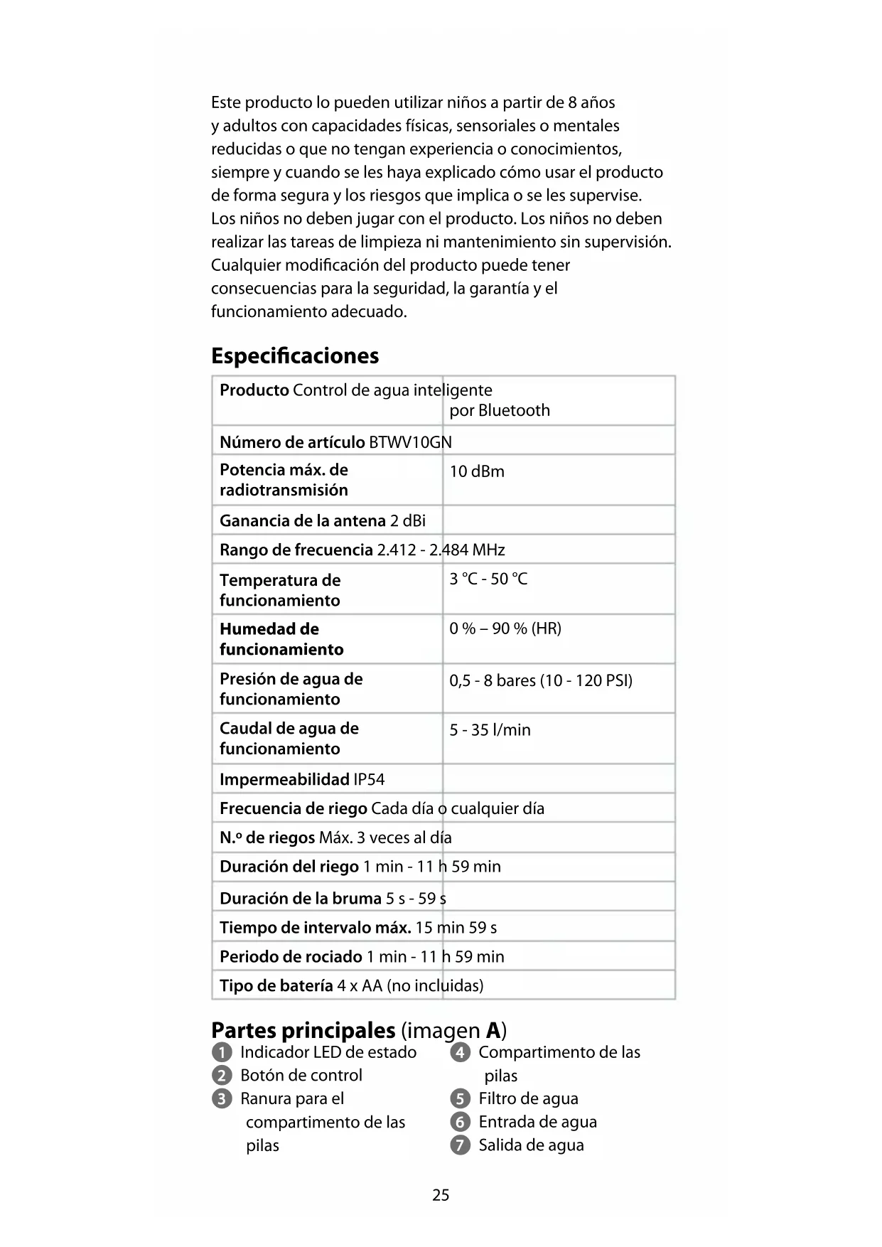 Impermeabilidad IP54 Frecuencia de riego Cada día o cualquier día N.º de riegos Máx. 3 veces al día Duración del riego 1 min - 11 h 59 min Duración de la bruma 5 s - 59 s Tiempo de intervalo máx. 15 min 59 s Periodo de rociado 1 min - 11 h 59 min Tipo de batería 4 x AA (no incluidas) Partes principales (imagen A) 1 Indicador LED de estado 2 Botón de control 3 Ranura para el compartimento de las pilas 4 Compartimento de las pilas 5 Filtro de agua 6 Entrada de agua 7 Salida de agua26 Vista general de la aplicación (imagen B) 1 Último uso de agua 2 Estado de las pilas / Modo actualmente activo / Tiempo restante hasta el siguiente riego 3 Modo manual 4 Parámetro 5 Cambiar entre grados centígrados y grados Fahrenheit. 6 Ajuste de los programas de riego 7 Sensor 8 Detalles e instrucciones Instrucciones de seguridad