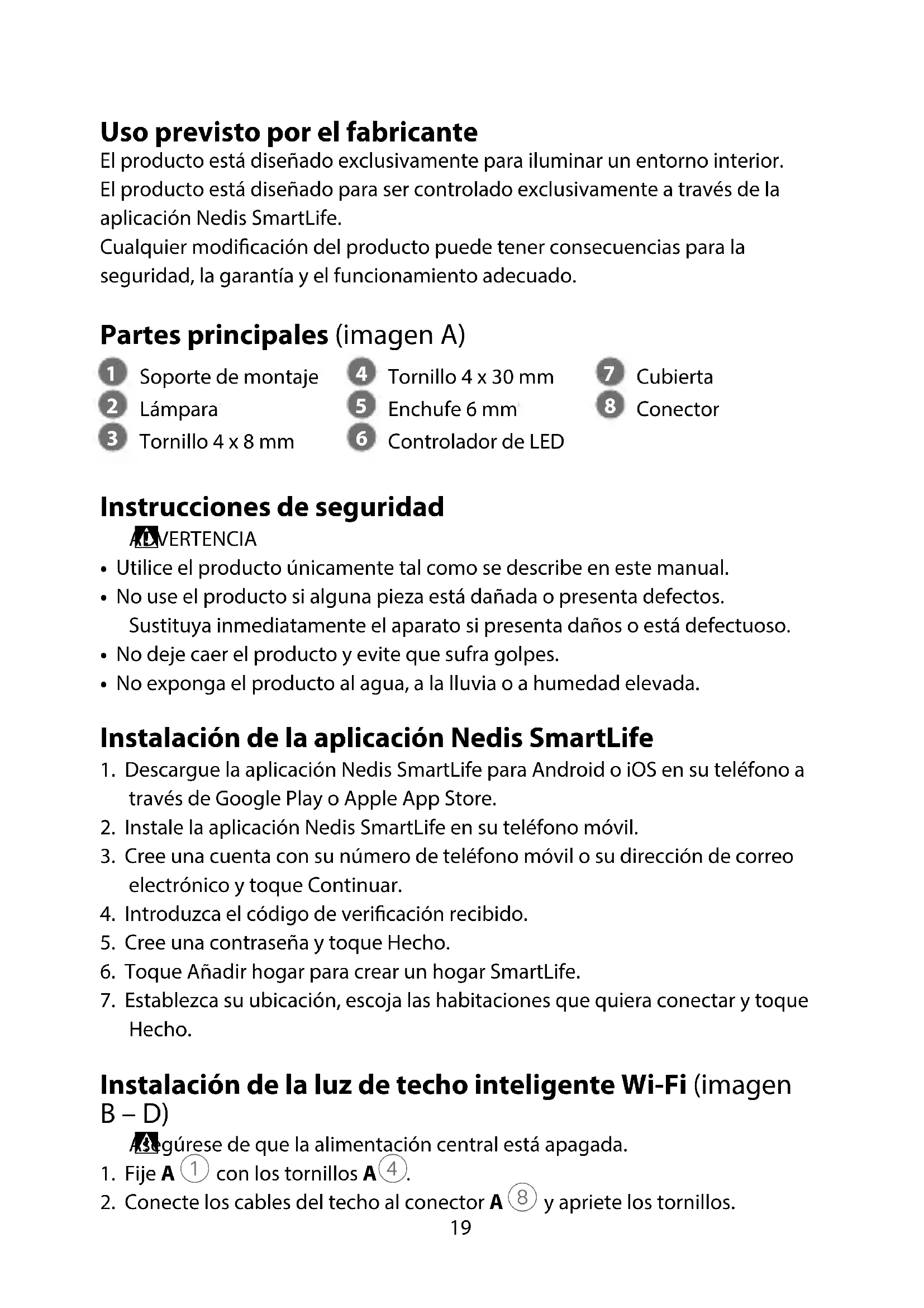 Guía de inicio rápido Luz de techo inteligente Wi-Fi WIFILAW10WT Para más información, consulte el manual ampliado en línea: ned.is/wilaw10wt19 Uso previsto por el fabricante El producto está diseñado exclusivamente para iluminar un entorno interior. El producto está diseñado para ser controlado exclusivamente a través de la aplicación Nedis SmartLife. Cualquier modicación del producto puede tener consecuencias para la seguridad, la garantía y el funcionamiento adecuado. Partes principales (imagen A)