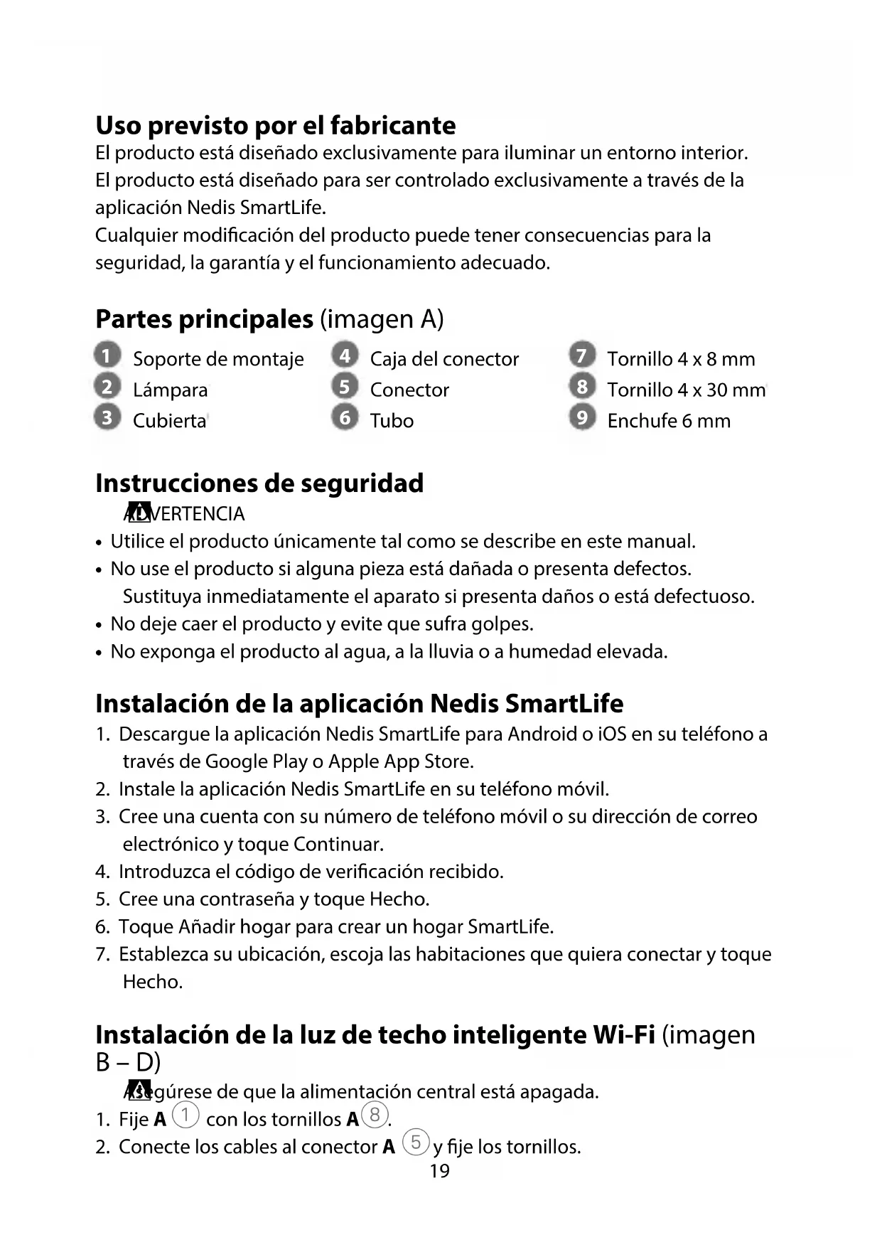 Guía de inicio rápido Luz de techo inteligente Wi-Fi WIFILAC30WT Para más información, consulte el manual ampliado en línea: ned.is/wilac30wt19 Uso previsto por el fabricante El producto está diseñado exclusivamente para iluminar un entorno interior. El producto está diseñado para ser controlado exclusivamente a través de la aplicación Nedis SmartLife. Cualquier modicación del producto puede tener consecuencias para la seguridad, la garantía y el funcionamiento adecuado. Partes principales (imagen A)