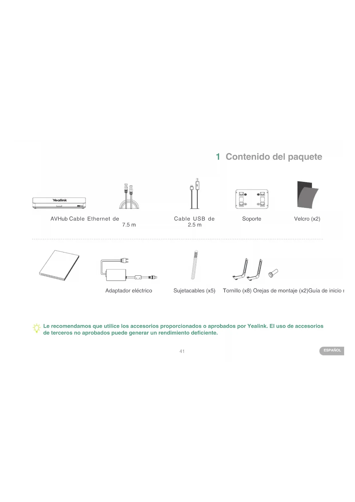 Adaptador eléctrico Velcro (x2) Le recomendamos que utilice los accesorios proporcionados o aprobados por Yealink El uso de accesorios de terceros no aprobados puede generar un rendimiento deficiente Sujetacables (x5)42 ESPAÑOL 2 Instrucciones del interfaz de hardware