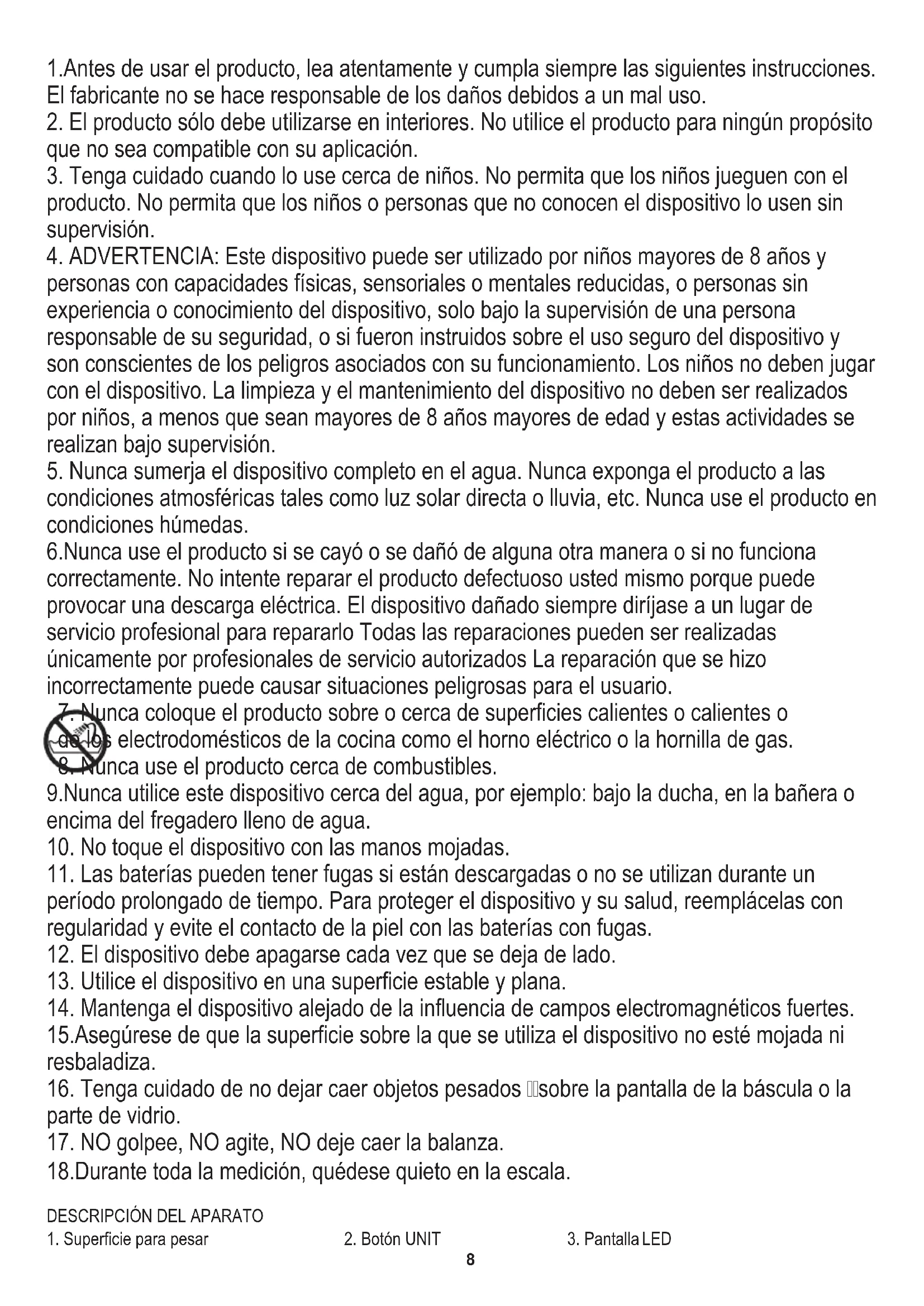 16. Tenga cuidado de no dejar caer objetos pesados sobre la pantalla de la báscula o la
