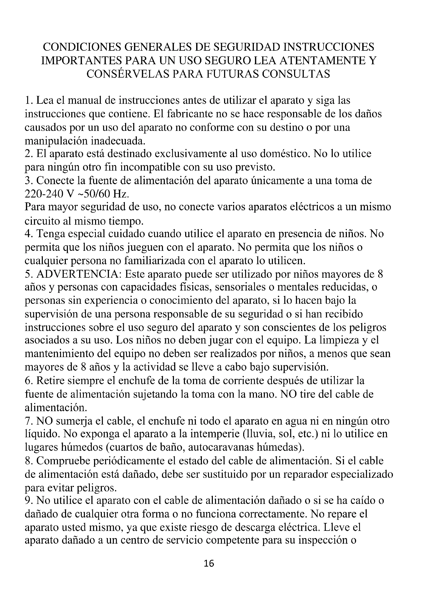 9. No utilice el aparato con el cable de alimentación dañado o si se ha caído o