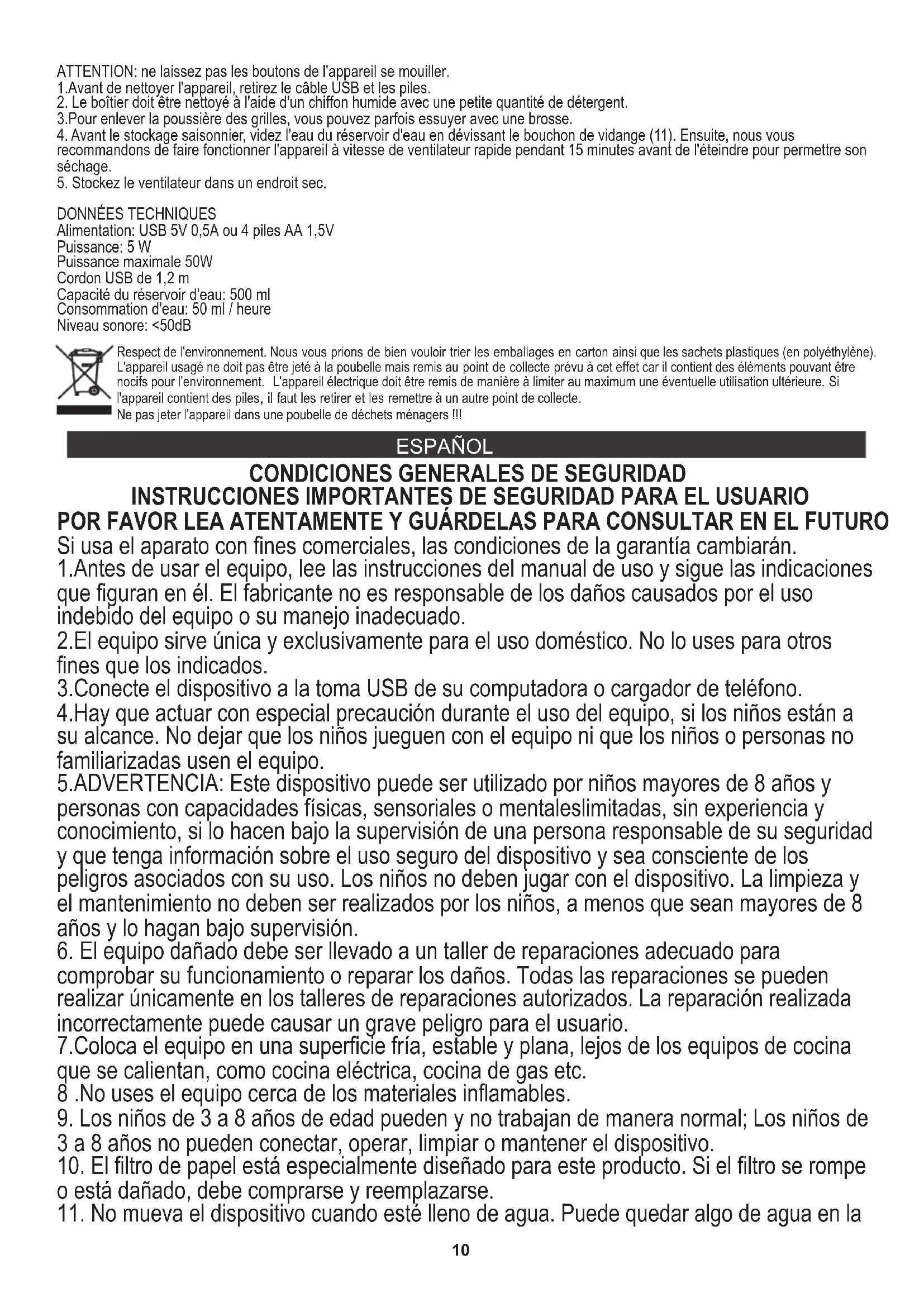 4. El dispositivo funcionará hasta aproximadamente 8-10 horas a baja velocidad del ventilador después de llenar el tanque de agua con 500 ml de agua limpia.