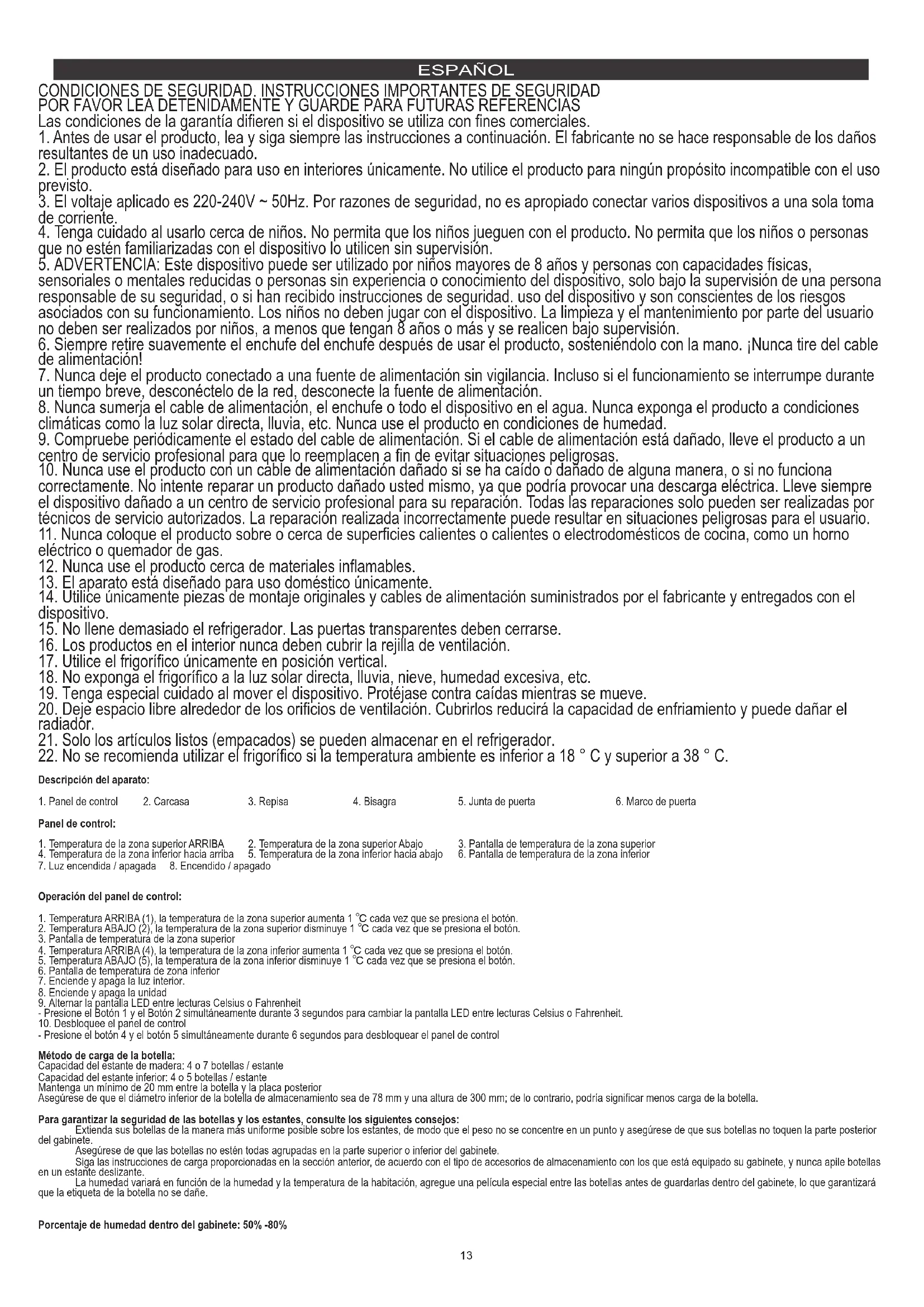 Porcentaje de humedad dentro del gabinete: 50% -80% CONDICIONES DE SEGURIDAD. INSTRUCCIONES IMPORTANTES DE SEGURIDAD POR FAVOR LEA DETENIDAMENTE Y GUARDE PARA FUTURAS REFERENCIAS Las condiciones de la garantía difieren si el dispositivo se utiliza con fines comerciales. 1. Antes de usar el producto, lea y siga siempre las instrucciones a continuación. El fabricante no se hace responsable de los daños resultantes de un uso inadecuado. 2. El producto está diseñado para uso en interiores únicamente. No utilice el producto para ningún propósito incompatible con el uso previsto. 3. El voltaje aplicado es 220-240V ~ 50Hz. Por razones de seguridad, no es apropiado conectar varios dispositivos a una sola toma de corriente. 4. Tenga cuidado al usarlo cerca de niños. No permita que los niños jueguen con el producto. No permita que los niños o personas que no estén familiarizadas con el dispositivo lo utilicen sin supervisión.