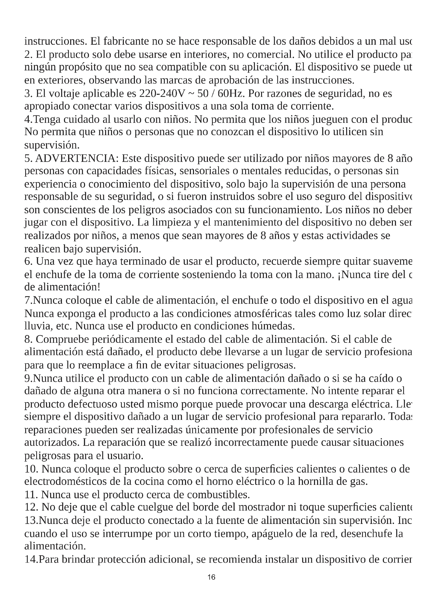 7.Nunca coloque el cable de alimentación, el enchufe o todo el dispositivo en el agua. Nunca exponga el producto a las condiciones atmosféricas tales como luz solar directa o lluvia, etc. Nunca use el producto en condiciones húmedas.