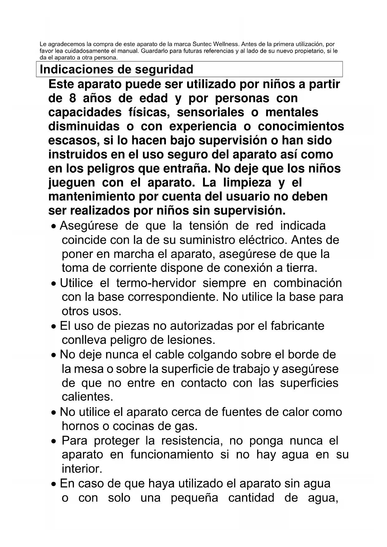 Termo-hervidor WAK-8489 thermo Instrucciones de usoLe agradecemos la compra de este aparato de la marca Suntec Wellness. Antes de la primera utilización, por favor lea cuidadosamente el manual. Guardarlo para futuras referencias y al lado de su nuevo propietario, si le da el aparato a otra persona. Indicaciones de seguridad Este aparato puede ser utilizado por niños a partir de 8 años de edad y por personas con capacidades físicas, sensoriales o mentales disminuidas o con experiencia o conocimientos escasos, si lo hacen bajo supervisión o han sido instruidos en el uso seguro del aparato así como en los peligros que entraña. No deje que los niños jueguen con el aparato. La limpieza y el mantenimiento por cuenta del usuario no deben ser realizados por niños sin supervisión.