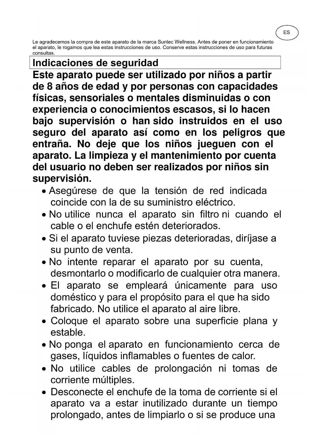 Le agradecemos la compra de este aparato de la marca Suntec Wellness. Antes de poner en funcionamiento el aparato, le rogamos que lea estas instrucciones de uso. Conserve estas instrucciones de uso para futuras consultas. Indicaciones de seguridad Este aparato puede ser utilizado por niños a partir de 8 años de edad y por personas con capacidades físicas, sensoriales o mentales disminuidas o con experiencia o conocimientos escasos, si lo hacen bajo supervisión o han sido instruidos en el uso seguro del aparato así como en los peligros que entraña. No deje que los niños jueguen con el aparato. La limpieza y el mantenimiento por cuenta del usuario no deben ser realizados por niños sin supervisión.