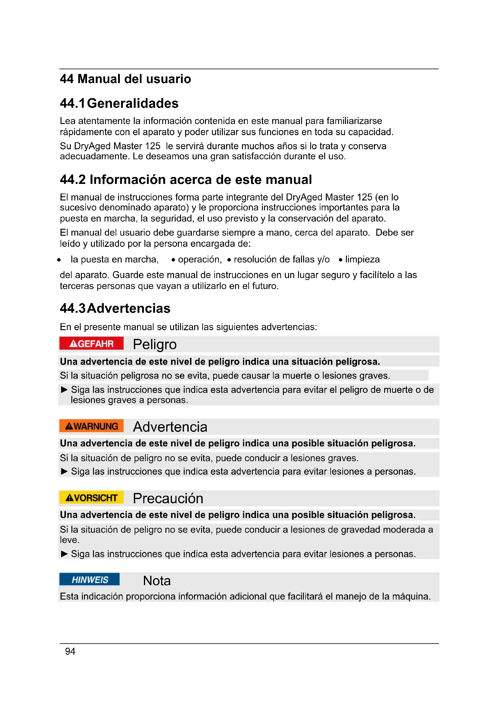 El manual de instrucciones forma parte integrante del DryAged Master 125 (en lo sucesivo denominado aparato) y le proporciona instrucciones importantes para la puesta en marcha, la seguridad, el uso previsto y la conservación del aparato. El manual del usuario debe guardarse siempre a mano, cerca del aparato. Debe ser leído y utilizado por la persona encargada de: la puesta en marcha, operación, resolución de fallas y/o limpieza del aparato. Guarde este manual de instrucciones en un lugar seguro y facilítelo a las terceras personas que vayan a utilizarlo en el futuro.