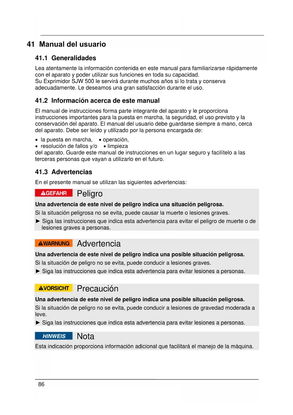 En el presente manual se utilizan las siguientes advertencias: Peligro Una advertencia de este nivel de peligro indica una situación peligrosa. Si la situación peligrosa no se evita, puede causar la muerte o lesiones graves. ► Siga las instrucciones que indica esta advertencia para evitar el peligro de muerte o de lesiones graves a personas. Advertencia Una advertencia de este nivel de peligro indica una posible situación peligrosa. Si la situación de peligro no se evita, puede conducir a lesiones graves. ► Siga las instrucciones que indica esta advertencia para evitar lesiones a personas. Precaución Una advertencia de este nivel de peligro indica una posible situación peligrosa. Si la situación de peligro no se evita, puede conducir a lesiones de gravedad moderada a leve. ► Siga las instrucciones que indica esta advertencia para evitar lesiones a personas. Nota Esta indicación proporciona información adicional que facilitará el manejo de la máquina.87 42 Seguridad En este capítulo obtendrá importantes instrucciones de seguridad sobre la manipulación del aparato. Este aparato cumple la normativa de seguridad vigente. No obstante, el uso indebido puede causar lesiones a personas y daños materiales.