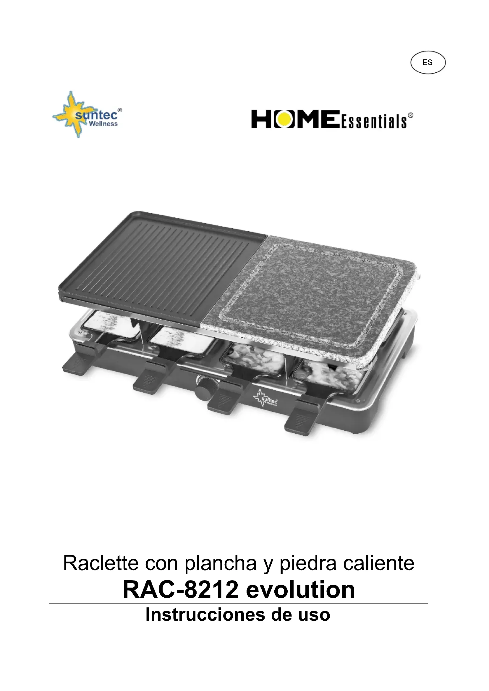 Raclette con plancha y piedra caliente RAC-8212 evolution Instrucciones de usoLe agradecemos la compra de este aparato de la marca Suntec Wellness. Antes de la primera utilización, por favor lea cuidadosamente el manual. Guardarlo para futuras referencias y al lado de su nuevo propietario, si le da el aparato a otra persona. Indicaciones de seguridad Este aparato puede ser utilizado por niños a partir de 8 años de edad y por personas con capacidades físicas, sensoriales o mentales disminuidas o con experiencia o conocimientos escasos, si lo hacen bajo supervisión o han sido instruidos en el uso seguro del aparato así como en los peligros que entraña. No deje que los niños jueguen con el aparato. La limpieza y el mantenimiento por cuenta del usuario no deben ser realizados por niños sin supervisión. Los niños menores de 3 años que no estén bajo supervisión permanente no deberán poder tener acceso al aparato. Los niños mayores de 3 años y menores de 8, únicamente deberán encender y apagar el aparato cuando este esté situado o instalado en su posición de uso normal, hayan sido instruidos en lo concerniente al uso seguro del aparato, están supervisados y hayan comprendido los posibles riesgos. Los niños mayores de 3 años y menores de 8, no deberán conectar el aparato a la toma de corriente, regularlo, limpiarlo ni realizar su mantenimiento.