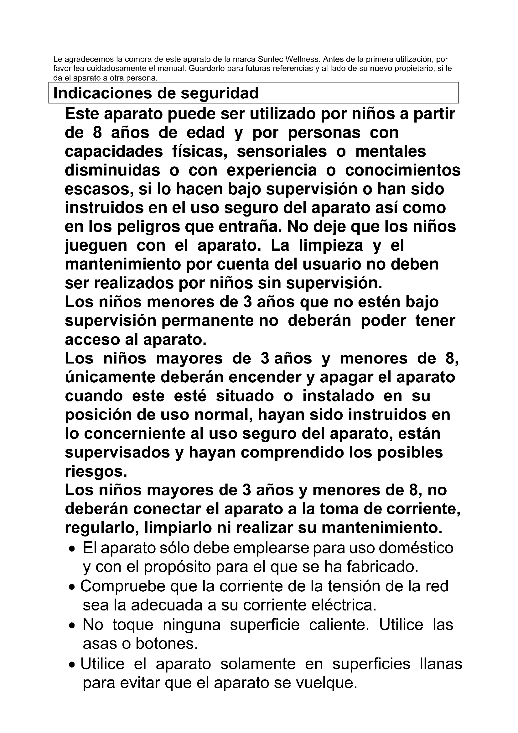 Deshidratador de alimentos RAC-8151 Flex8 metal/metal RAC-8069 Flex8 metal/stone Instrucciones de usoLe agradecemos la compra de este aparato de la marca Suntec Wellness. Antes de la primera utilización, por favor lea cuidadosamente el manual. Guardarlo para futuras referencias y al lado de su nuevo propietario, si le da el aparato a otra persona. Indicaciones de seguridad Este aparato puede ser utilizado por niños a partir de 8 años de edad y por personas con capacidades físicas, sensoriales o mentales disminuidas o con experiencia o conocimientos escasos, si lo hacen bajo supervisión o han sido instruidos en el uso seguro del aparato así como en los peligros que entraña. No deje que los niños jueguen con el aparato. La limpieza y el mantenimiento por cuenta del usuario no deben ser realizados por niños sin supervisión. Los niños menores de 3 años que no estén bajo supervisión permanente no deberán poder tener acceso al aparato. Los niños mayores de 3 años y menores de 8, únicamente deberán encender y apagar el aparato cuando este esté situado o instalado en su posición de uso normal, hayan sido instruidos en lo concerniente al uso seguro del aparato, están supervisados y hayan comprendido los posibles riesgos. Los niños mayores de 3 años y menores de 8, no deberán conectar el aparato a la toma de corriente, regularlo, limpiarlo ni realizar su mantenimiento.