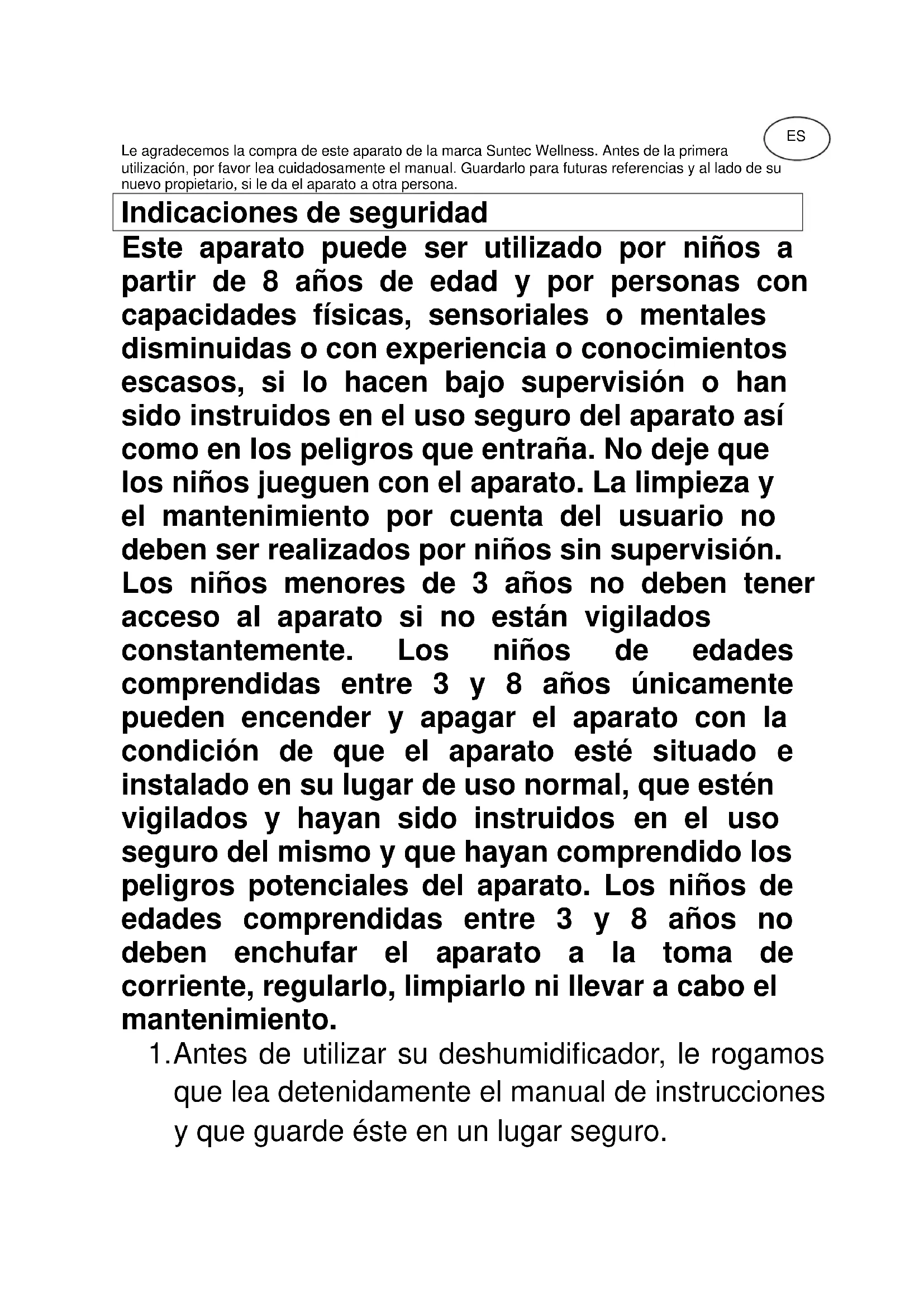 DryFix SUNTEC WELLNESS GMBH / HOLZSTRASSE 2 / 40 221 DÜSSELDORF / GERMANYES Le agradecemos la compra de este aparato de la marca Suntec Wellness. Antes de la primera utilización, por favor lea cuidadosamente el manual. Guardarlo para futuras referencias y al lado de su nuevo propietario, si le da el aparato a otra persona. Indicaciones de seguridad Este aparato puede ser utilizado por niños a partir de 8 años de edad y por personas con capacidades físicas, sensoriales o mentales disminuidas o con experiencia o conocimientos escasos, si lo hacen bajo supervisión o han sido instruidos en el uso seguro del aparato así como en los peligros que entraña. No deje que los niños jueguen con el aparato. La limpieza y el mantenimiento por cuenta del usuario no deben ser realizados por niños sin supervisión. Los niños menores de 3 años no deben tener acceso al aparato si no están vigilados constantemente. Los niños de edades comprendidas entre 3 y 8 años únicamente pueden encender y apagar el aparato con la condición de que el aparato esté situado e instalado en su lugar de uso normal, que estén vigilados y hayan sido instruidos en el uso seguro del mismo y que hayan comprendido los peligros potenciales del aparato. Los niños de edades comprendidas entre 3 y 8 años no deben enchufar el aparato a la toma de corriente, regularlo, limpiarlo ni llevar a cabo el mantenimiento.