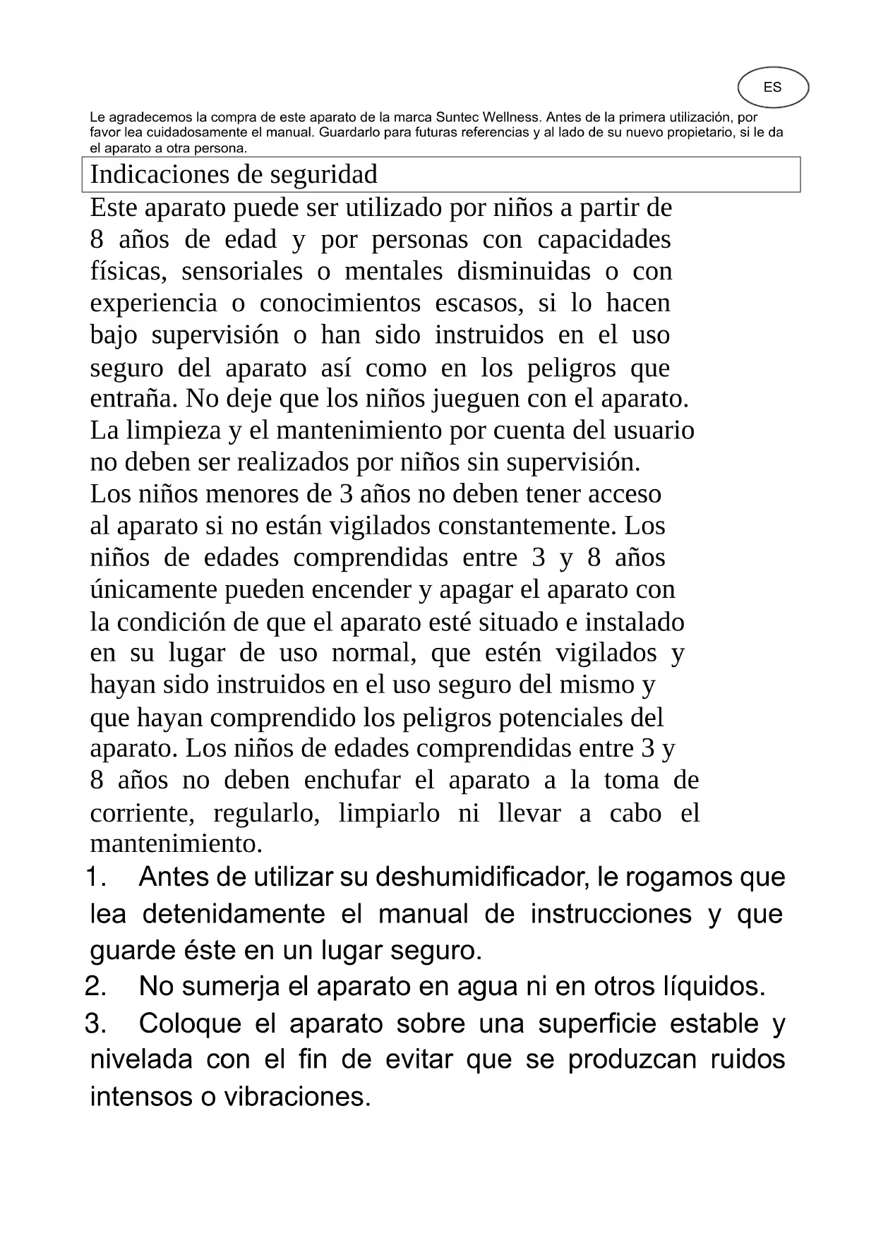 DryFix 16 select APP SUNTEC WELLNESS GMBH / HOLZSTRASSE 2 / 40221 DÜSSELDORF / GERMANYES Le agradecemos la compra de este aparato de la marca Suntec Wellness. Antes de la primera utilización, por favor lea cuidadosamente el manual. Guardarlo para futuras referencias y al lado de su nuevo propietario, si le da el aparato a otra persona. Indicaciones de seguridad Este aparato puede ser utilizado por niños a partir de 8 años de edad y por personas con capacidades físicas, sensoriales o mentales disminuidas o con experiencia o conocimientos escasos, si lo hacen bajo supervisión o han sido instruidos en el uso seguro del aparato así como en los peligros que entraña. No deje que los niños jueguen con el aparato. La limpieza y el mantenimiento por cuenta del usuario no deben ser realizados por niños sin supervisión. Los niños menores de 3 años no deben tener acceso al aparato si no están vigilados constantemente. Los niños de edades comprendidas entre 3 y 8 años únicamente pueden encender y apagar el aparato con la condición de que el aparato esté situado e instalado en su lugar de uso normal, que estén vigilados y hayan sido instruidos en el uso seguro del mismo y que hayan comprendido los peligros potenciales del aparato. Los niños de edades comprendidas entre 3 y 8 años no deben enchufar el aparato a la toma de corriente, regularlo, limpiarlo ni llevar a cabo el mantenimiento.