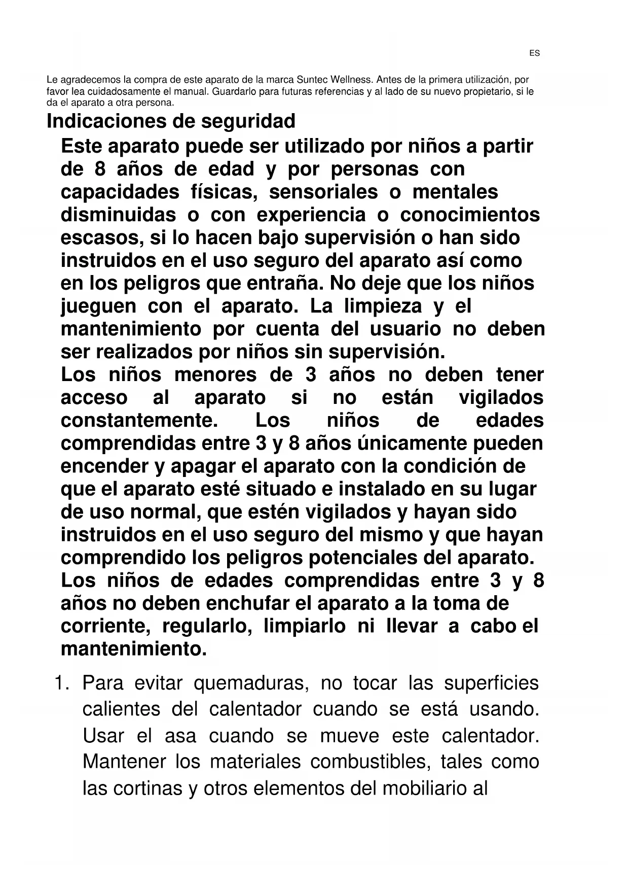 © 2020 KLIMATRONIC® Heat Supreme SUNTEC WELLNESS GMBH / HOLZSTRASSE 2 / 40221 DÜSSELDORF / GERMANYLe agradecemos la compra de este aparato de la marca Suntec Wellness. Antes de la primera utilización, por favor lea cuidadosamente el manual. Guardarlo para futuras referencias y al lado de su nuevo propietario, si le da el aparato a otra persona. Indicaciones de seguridad Este aparato puede ser utilizado por niños a partir de 8 años de edad y por personas con capacidades físicas, sensoriales o mentales disminuidas o con experiencia o conocimientos escasos, si lo hacen bajo supervisión o han sido instruidos en el uso seguro del aparato así como en los peligros que entraña. No deje que los niños jueguen con el aparato. La limpieza y el mantenimiento por cuenta del usuario no deben ser realizados por niños sin supervisión. Los niños menores de 3 años no deben tener acceso al aparato si no están vigilados constantemente. Los niños de edades comprendidas entre 3 y 8 años únicamente pueden encender y apagar el aparato con la condición de que el aparato esté situado e instalado en su lugar de uso normal, que estén vigilados y hayan sido instruidos en el uso seguro del mismo y que hayan comprendido los peligros potenciales del aparato. Los niños de edades comprendidas entre 3 y 8 años no deben enchufar el aparato a la toma de corriente, regularlo, limpiarlo ni llevar a cabo el mantenimiento.
