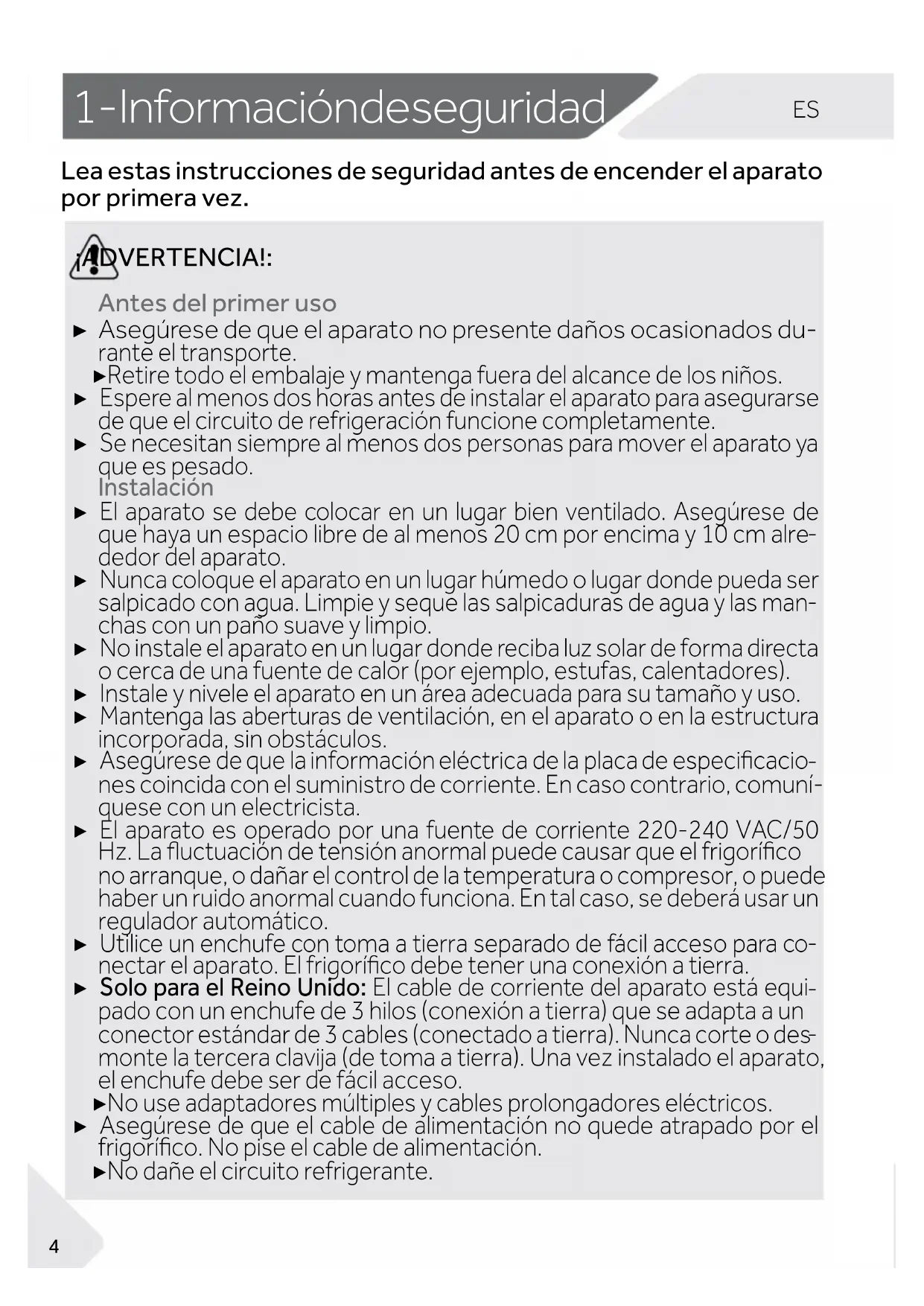 Lea estas instrucciones de seguridad antes de encender el aparato por primera vez. ¡ADVERTENCIA!: Antes del primer uso ▶ Asegúrese de que el aparato no presente daños ocasionados du- rante el transporte. ▶ Retire todo el embalaje y mantenga fuera del alcance de los niños. ▶ Espere al menos dos horas antes de instalar el aparato para asegurarse de que el circuito de refrigeración funcione completamente. ▶ Se necesitan siempre al menos dos personas para mover el aparato ya que es pesado. Instalación ▶ El aparato se debe colocar en un lugar bien ventilado. Asegúrese de que haya un espacio libre de al menos 20 cm por encima y 10 cm alre