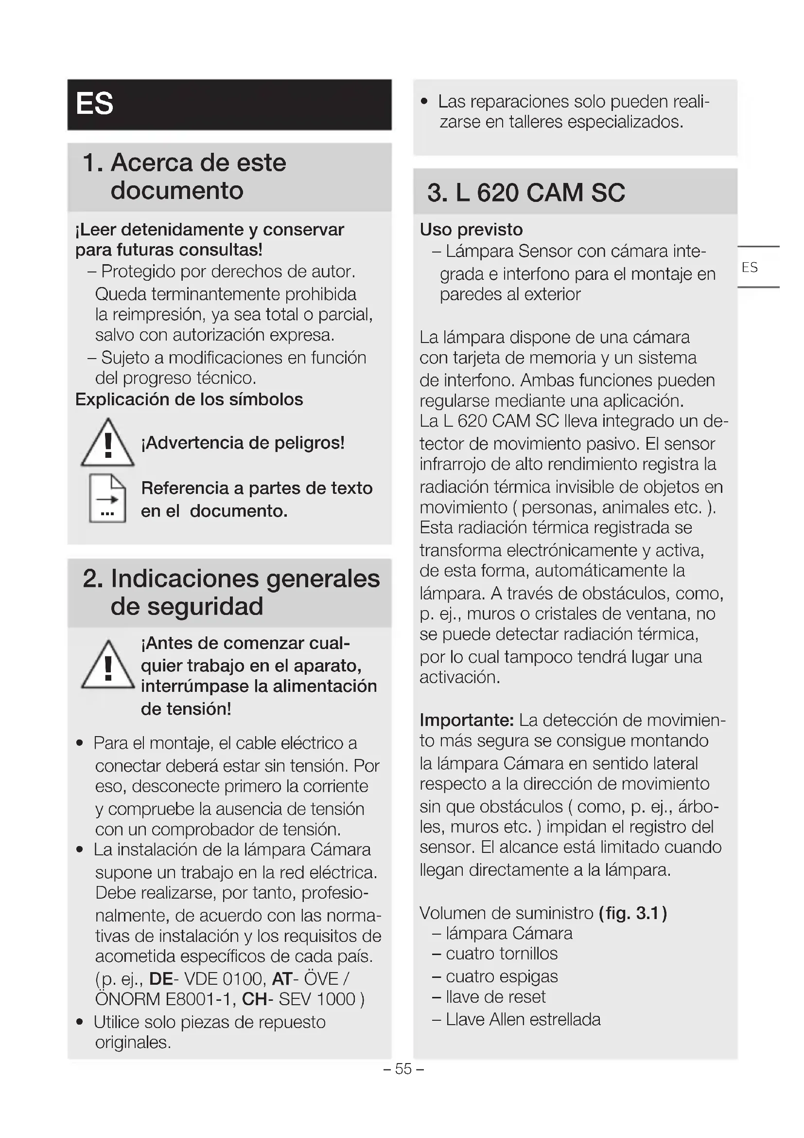 Uso previsto – Lámpara Sensor con cámara inte- grada e interfono para el montaje en paredes al exterior La lámpara dispone de una cámara con tarjeta de memoria y un sistema de interfono. Ambas funciones pueden regularse mediante una aplicación. La L620CAM SC lleva integrado un de- tector de movimiento pasivo. El sensor infrarrojo de alto rendimiento registra la radiación térmica invisible de objetos en movimiento ( personas, animales etc. ). Esta radiación térmica registrada se transforma electrónicamente y activa, de esta forma, automáticamente la lámpara. A través de obstáculos, como, p. ej., muros o cristales de ventana, no se puede detectar radiación térmica, por lo cual tampoco tendrá lugar una activación. Importante: La detección de movimien- to más segura se consigue montando la lámpara Cámara en sentido lateral respecto a la dirección de movimiento sin que obstáculos ( como, p. ej., árbo- les, muros etc. ) impidan el registro del sensor. El alcance está limitado cuando llegan directamente a la lámpara. Volumen de suministro ( fig.3.1 ) – lámpara Cámara – cuatro tornillos – cuatro espigas – llave de reset – Llave Allen estrellada