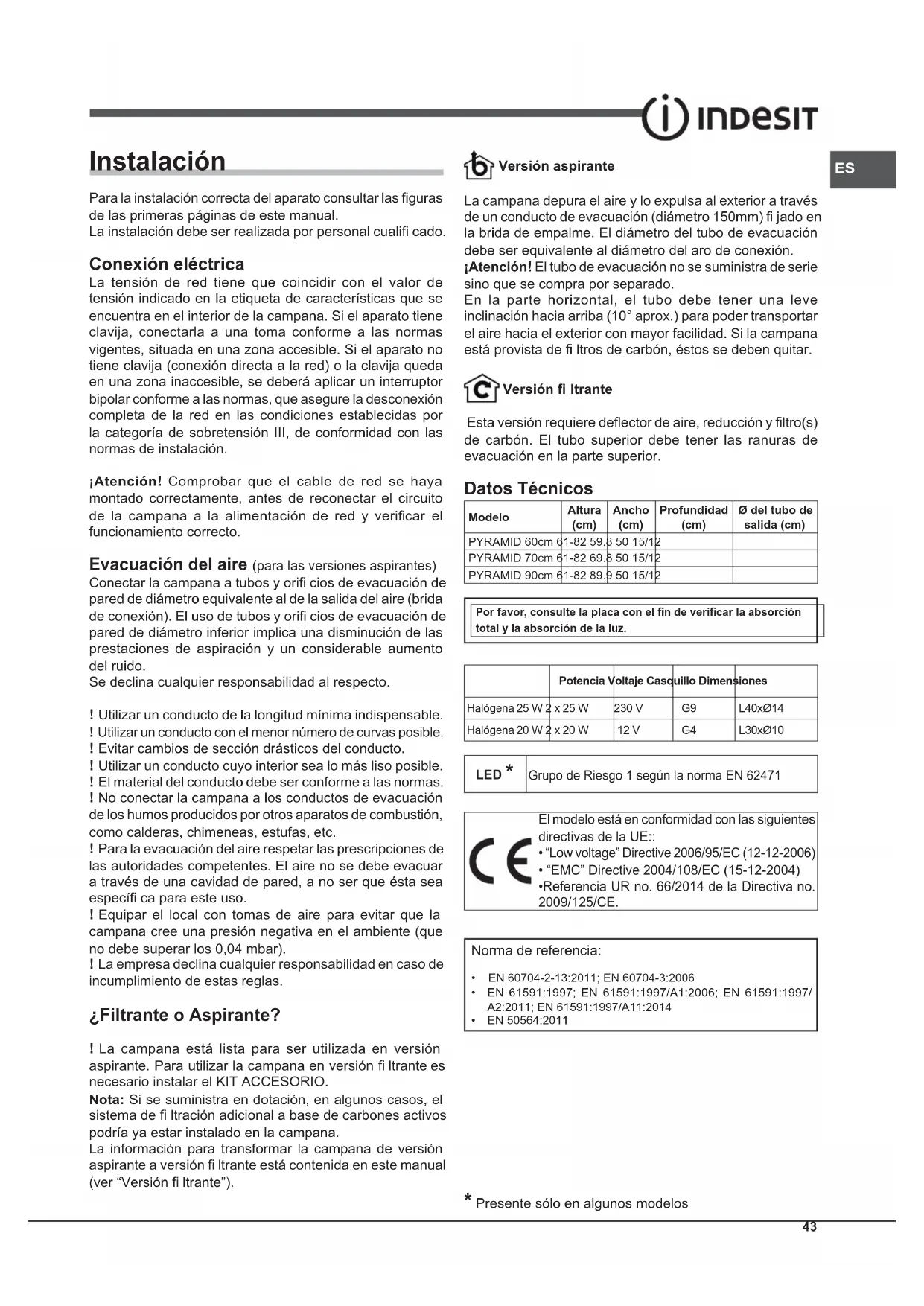 Instalación Para la instalación correcta del aparato consultar las fi guras de las primeras páginas de este manual. La instalación debe ser realizada por personal cualifi cado. Conexión eléctrica La tensión de red tiene que coincidir con el valor de tensión indicado en la etiqueta de características que se encuentra en el interior de la campana. Si el aparato tiene clavija, conectarla a una toma conforme a las normas vigentes, situada en una zona accesible. Si el aparato no tiene clavija (conexión directa a la red) o la clavija queda en una zona inaccesible, se deberá aplicar un interruptor bipolar conforme a las normas, que asegure la desconexión completa de la red en las condiciones establecidas por la categoría de sobretensión III, de conformidad con las normas de instalación. ¡Atención! Comprobar que el cable de red se haya montado correctamente, antes de reconectar el circuito de la campana a la alimentación de red y verifi car el funcionamiento correcto. Evacuación del aire (para las versiones aspirantes) Conectar la campana a tubos y orifi cios de evacuación de pared de diámetro equivalente al de la salida del aire (brida de conexión). El uso de tubos y orifi cios de evacuación de pared de diámetro inferior implica una disminución de las prestaciones de aspiración y un considerable aumento del ruido. Se declina cualquier responsabilidad al respecto. ! Utilizar un conducto de la longitud mínima indispensable. ! Utilizar un conducto con el menor número de curvas posible. ! Evitar cambios de sección drásticos del conducto. ! Utilizar un conducto cuyo interior sea lo más liso posible. ! El material del conducto debe ser conforme a las normas. ! No conectar la campana a los conductos de evacuación de los humos producidos por otros aparatos de combustión, como calderas, chimeneas, estufas, etc. ! Para la evacuación del aire respetar las prescripciones de las autoridades competentes. El aire no se debe evacuar a través de una cavidad de pared, a no ser que ésta sea específi ca para este uso. ! Equipar el local con tomas de aire para evitar que la campana cree una presión negativa en el ambiente (que no debe superar los 0,04 mbar). ! La empresa declina cualquier responsabilidad en caso de incumplimiento de estas reglas. ¿Filtrante o Aspirante? ! La campana está lista para ser utilizada en versión aspirante. Para utilizar la campana en versión fi ltrante es necesario instalar el KIT ACCESORIO. Nota: Si se suministra en dotación, en algunos casos, el sistema de fi ltración adicional a base de carbones activos podría ya estar instalado en la campana. La información para transformar la campana de versión aspirante a versión fi ltrante está contenida en este manual (ver “Versión fi ltrante”). Versión aspirante La campana depura el aire y lo expulsa al exterior a través de un conducto de evacuación (diámetro 150mm) fi jado en la brida de empalme. El diámetro del tubo de evacuación debe ser equivalente al diámetro del aro de conexión. ¡Atención! El tubo de evacuación no se suministra de serie sino que se compra por separado. En la parte horizontal, el tubo debe tener una leve inclinación hacia arriba (10° aprox.) para poder transportar el aire hacia el exterior con mayor facilidad. Si la campana está provista de fi ltros de carbón, éstos se deben quitar. Versión fi ltrante Esta versión requiere defl ector de aire, reducción y fi ltro(s) de carbón. El tubo superior debe tener las ranuras de evacuación en la parte superior. Datos Técnicos ModeloAltura (cm) Ancho (cm) Profundidad (cm) Ø del tubo de salida (cm)PYRAMID 60cm 61-82 59.8 50 15/12PYRAMID 70cm 61-82 69.8 50 15/12PYRAMID 90cm 61-82 89.9 50 15/12 Por favor, consulte la placa con el fi n de verifi car la absorción total y la absorción de la luz.Potencia Voltaje Casquillo DimensionesHalógena 25 W 2 x 25 W 230 V G9 L40xØ14Halógena 20 W 2 x 20 W 12 V G4 L30xØ10LED *Grupo de Riesgo 1 según la norma EN 62471 El modelo está en conformidad con las siguientes directivas de la UE::