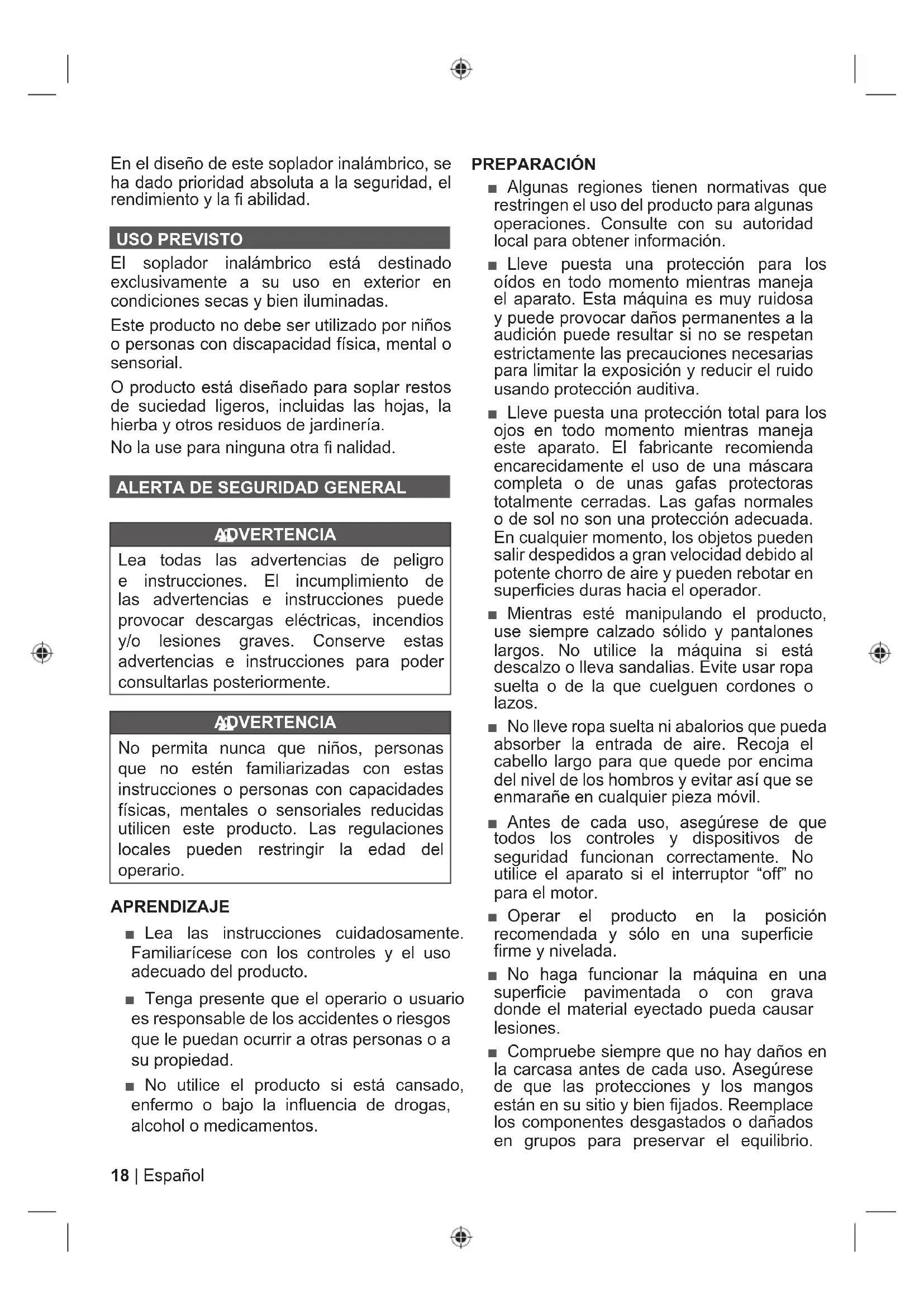 ADVERTENCIA Lea todas las advertencias de peligro e instrucciones. El incumplimiento de las advertencias e instrucciones puede provocar descargas eléctricas, incendios y/o lesiones graves. Conserve estas advertencias e instrucciones para poder consultarlas posteriormente. ADVERTENCIA No permita nunca que niños, personas que no estén familiarizadas con estas instrucciones o personas con capacidades físicas, mentales o sensoriales reducidas utilicen este producto. Las regulaciones locales pueden restringir la edad del operario. APRENDIZAJE ■ Lea las instrucciones cuidadosamente. Familiarícese con los controles y el uso adecuado del producto. ■ Tenga presente que el operario o usuario es responsable de los accidentes o riesgos que le puedan ocurrir a otras personas o a su propiedad. ■ No utilice el producto si está cansado, enfermo o bajo la influencia de drogas, alcohol o medicamentos. PREPARACIÓN ■ Algunas regiones tienen normativas que restringen el uso del producto para algunas operaciones. Consulte con su autoridad local para obtener información. ■ Lleve puesta una protección para los oídos en todo momento mientras maneja el aparato. Esta máquina es muy ruidosa y puede provocar daños permanentes a la audición puede resultar si no se respetan estrictamente las precauciones necesarias para limitar la exposición y reducir el ruido usando protección auditiva. ■ Lleve puesta una protección total para los ojos en todo momento mientras maneja este aparato. El fabricante recomienda encarecidamente el uso de una máscara completa o de unas gafas protectoras totalmente cerradas. Las gafas normales o de sol no son una protección adecuada. En cualquier momento, los objetos pueden salir despedidos a gran velocidad debido al potente chorro de aire y pueden rebotar en superficies duras hacia el operador. ■ Mientras esté manipulando el producto, use siempre calzado sólido y pantalones largos. No utilice la máquina si está descalzo o lleva sandalias. Evite usar ropa suelta o de la que cuelguen cordones o lazos. ■ No lleve ropa suelta ni abalorios que pueda absorber la entrada de aire. Recoja el cabello largo para que quede por encima del nivel de los hombros y evitar así que se enmarañe en cualquier pieza móvil. ■ Antes de cada uso, asegúrese de que todos los controles y dispositivos de seguridad funcionan correctamente. No utilice el aparato si el interruptor “off” no para el motor. ■ Operar el producto en la posición recomendada y sólo en una superficie firme y nivelada. ■ No haga funcionar la máquina en una superficie pavimentada o con grava donde el material eyectado pueda causar lesiones. ■ Compruebe siempre que no hay daños en la carcasa antes de cada uso. Asegúrese de que las protecciones y los mangos están en su sitio y bien fijados. Reemplace los componentes desgastados o dañados en grupos para preservar el equilibrio.19 Español |