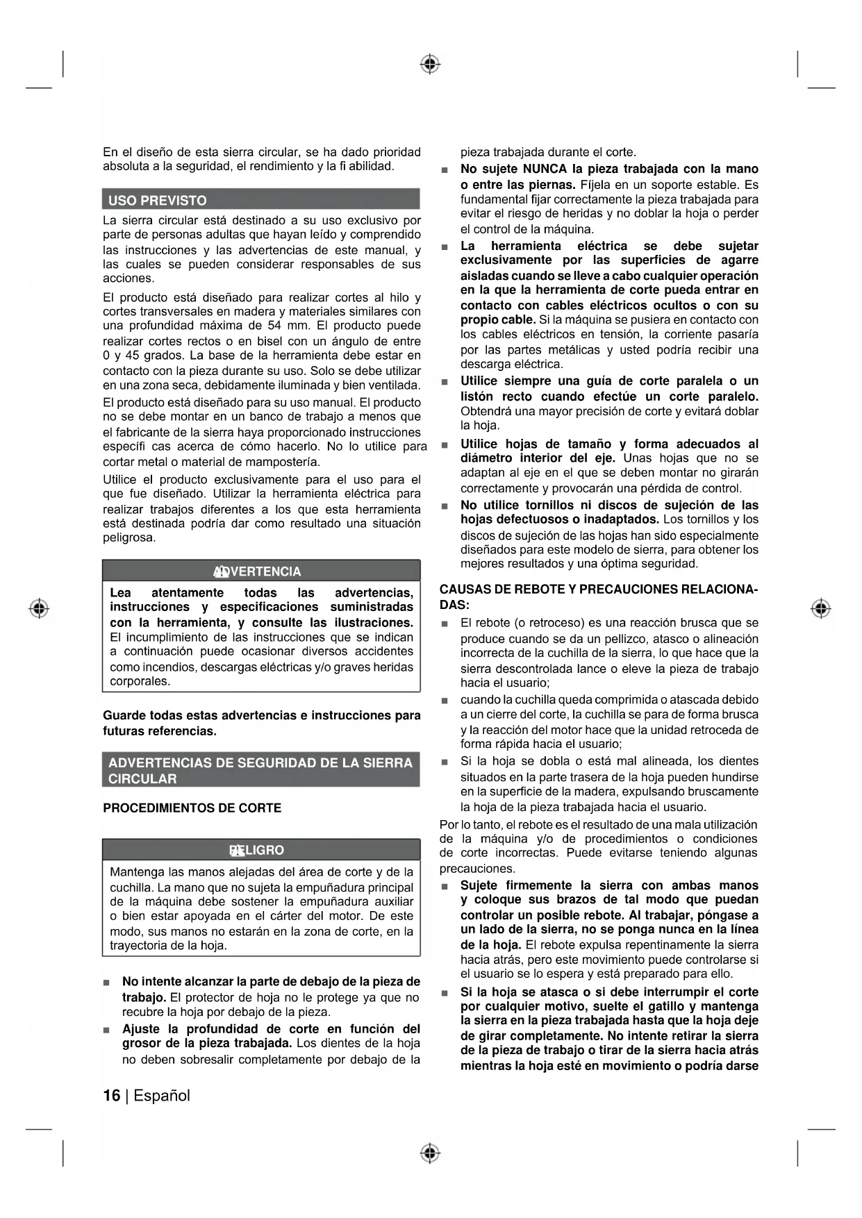 An das Stromnetz anschließen. Von dem Stromnetz trennen. Teile oder Zubehör getrennt erhältlich Sperren Öffnen Hinweis Mit den folgenden Symbolen wird die Bedeutung der verschiedenen Risikostufen, die mit dem Produkt einhergehen, dargestellt. GEFAHR Bezeichnet eine unmittelbare Gefahrensituation, die, falls nicht vermieden, zum Tod oder schweren Verletzungen führen kann. WARNUNG Bezeichnet eine mögliche Gefahrensituation, die, falls nicht vermieden, zum Tod oder schweren Verletzungen führen kann. ACHTUNG Bezeichnet eine mögliche Gefahrensituation, die, falls nicht vermieden, zu kleineren und mittleren Verletzungen führen kann. ACHTUNG (Ohne Warnsymbol) Weist auf eine Situation hin, die zu Sachschaden führen kann.16 | Español En el diseño de esta sierra circular, se ha dado prioridad absoluta a la seguridad, el rendimiento y la fi abilidad. USO PREVISTO La sierra circular está destinado a su uso exclusivo por parte de personas adultas que hayan leído y comprendido las instrucciones y las advertencias de este manual, y las cuales se pueden considerar responsables de sus acciones. El producto está diseñado para realizar cortes al hilo y cortes transversales en madera y materiales similares con una profundidad máxima de 54 mm. El producto puede realizar cortes rectos o en bisel con un ángulo de entre 0 y 45 grados. La base de la herramienta debe estar en contacto con la pieza durante su uso. Solo se debe utilizar en una zona seca, debidamente iluminada y bien ventilada. El producto está diseñado para su uso manual. El producto no se debe montar en un banco de trabajo a menos que el fabricante de la sierra haya proporcionado instrucciones específi cas acerca de cómo hacerlo. No lo utilice para cortar metal o material de mampostería. Utilice el producto exclusivamente para el uso para el que fue diseñado. Utilizar la herramienta eléctrica para realizar trabajos diferentes a los que esta herramienta está destinada podría dar como resultado una situación peligrosa. ADVERTENCIA Lea atentamente todas las advertencias, instrucciones y especificaciones suministradas con la herramienta, y consulte las ilustraciones. El incumplimiento de las instrucciones que se indican a continuación puede ocasionar diversos accidentes como incendios, descargas eléctricas y/o graves heridas corporales. Guarde todas estas advertencias e instrucciones para futuras referencias.