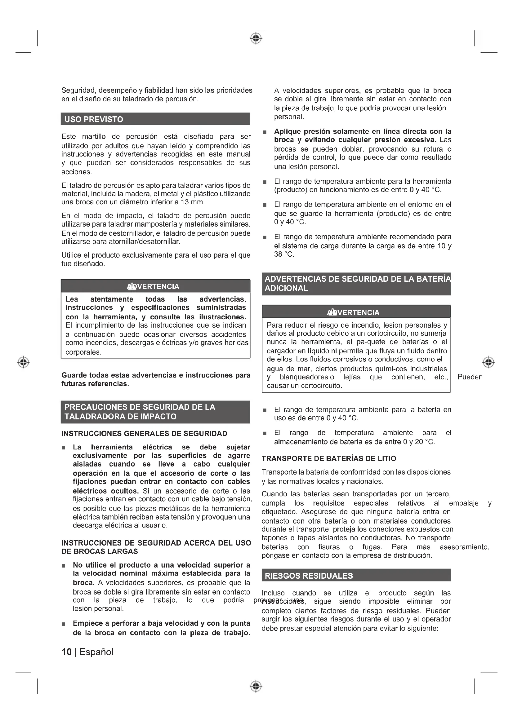 Transporte la batería de conformidad con las disposiciones y las normativas locales y nacionales. Cuando las baterías sean transportadas por un tercero, FXPSOD ORV UHTXLVLWRV HVSHFLDOHV UHODWLYRV DO HPEDODMH \ etiquetado. Asegúrese de que ninguna batería entra en contacto con otra batería o con materiales conductores GXUDQWHHOWUDQVSRUWHSURWHMDORVFRQHFWRUHVH[SXHVWRVFRQ tapones o tapas aislantes no conductoras. No transporte EDWHUtDV FRQ ¿VXUDV R IXJDV 3DUD PiV DVHVRUDPLHQWR póngase en contacto con la empresa de distribución. RIESGOS RESIDUALES Incluso cuando se utiliza el producto según las instrucciones, sigue siendo imposible eliminar por completo ciertos factores de riesgo residuales. Pueden surgir los siguientes riesgos durante el uso y el operador debe prestar especial atención para evitar lo siguiente:11 Español |