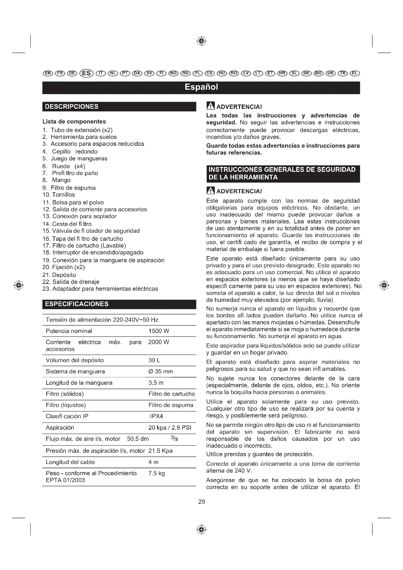 ESPECIFICACIONES Tensión de alimentación 220-240V~50 Hz Potencia nominal 1500 W Corriente eléctrica máx. para accesorios 2000 W Volumen del depósito 30 L Sistema de manguera Ø 35 mm Longitud de la manguera 3,5 m Filtro (sólidos) Filtro de cartucho Filtro (líquidos) Filtro de espuma Clasifi cación IP IPX4 Aspiración 20 kpa / 2.9 PSI Flujo máx. de aire l/s, motor 50.5 dm