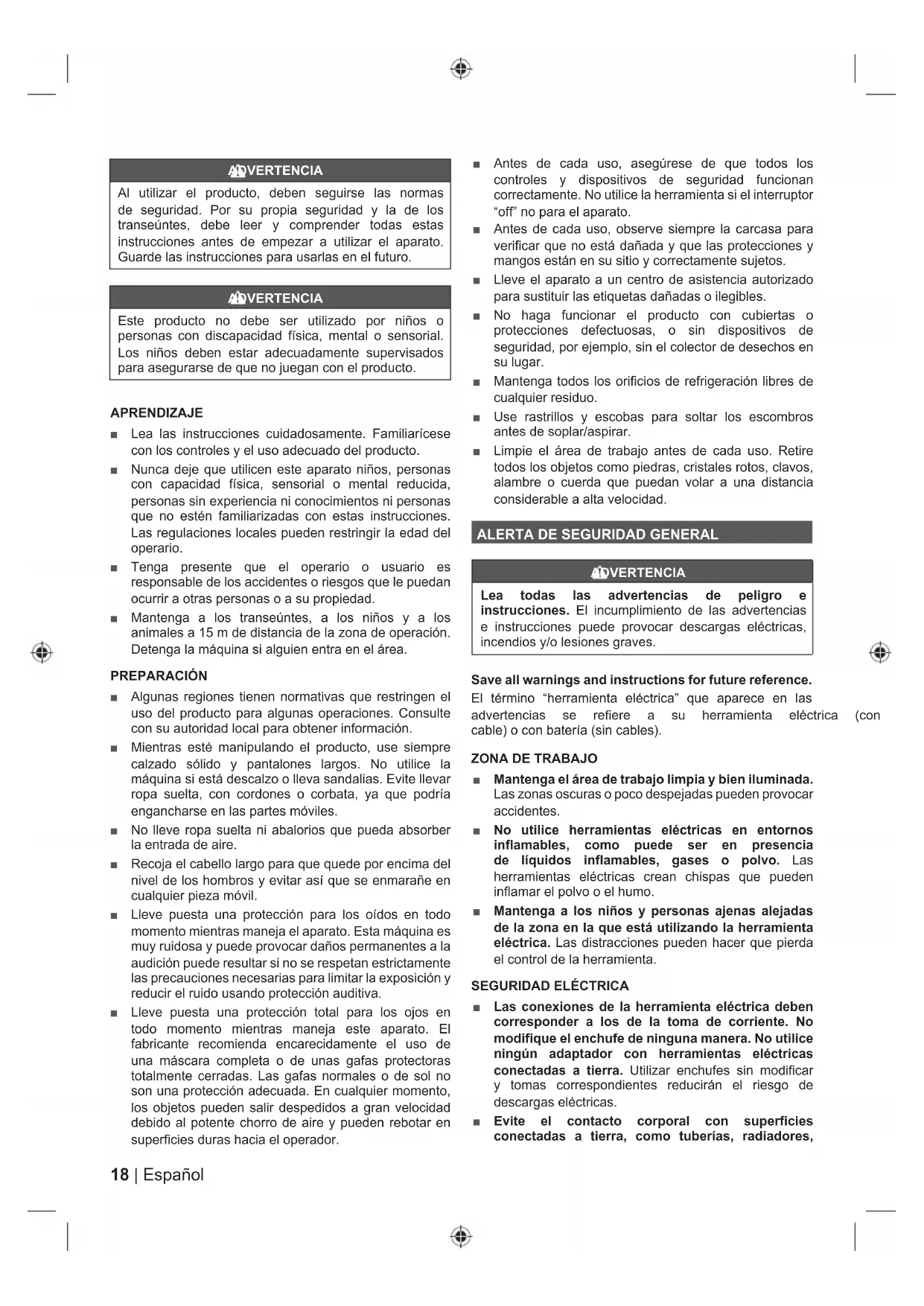 Anschließen an das Stromnetz Trennen vom Stromnetz HINWEIS: Warnung! Mit den folgenden Symbolen wird die Bedeutung der verschiedenen Risikostufen, die mit dem Produkt einhergehen, dargestellt. GEFAHR Weist auf eine unmittelbare gefährliche Situation hin, die bei Missachtung zu Tod oder ernsthafter Verletzung führen kann. WARNUNG IWeist auf eine mögliche gefährliche Situation hin, die bei Missachtung zu Tod oder ernsthafter Verletzung führen kann. VORSICHT IWeist auf eine mögliche gefährliche Situation hin, die bei Missachtung zu einer leichten oder mittleren Verletzung führen kann. VORSICHT Ohne Sicherheitswarnsymbol Bezeichnet eine Situation die zu Sachbeschädigungen führen kann.18 | Español ADVERTENCIA Al utilizar el producto, deben seguirse las normas de seguridad. Por su propia seguridad y la de los transeúntes, debe leer y comprender todas estas instrucciones antes de empezar a utilizar el aparato. Guarde las instrucciones para usarlas en el futuro. ADVERTENCIA Este producto no debe ser utilizado por niños o personas con discapacidad física, mental o sensorial. Los niños deben estar adecuadamente supervisados para asegurarse de que no juegan con el producto. APRENDIZAJE Ŷ Lea las instrucciones cuidadosamente. Familiarícese con los controles y el uso adecuado del producto. Ŷ Nunca deje que utilicen este aparato niños, personas con capacidad física, sensorial o mental reducida, personas sin experiencia ni conocimientos ni personas que no estén familiarizadas con estas instrucciones. Las regulaciones locales pueden restringir la edad del operario. Ŷ Tenga presente que el operario o usuario es responsable de los accidentes o riesgos que le puedan ocurrir a otras personas o a su propiedad. Ŷ Mantenga a los transeúntes, a los niños y a los animales a 15 m de distancia de la zona de operación. Detenga la máquina si alguien entra en el área. PREPARACIÓN Ŷ Algunas regiones tienen normativas que restringen el uso del producto para algunas operaciones. Consulte con su autoridad local para obtener información. Ŷ Mientras esté manipulando el producto, use siempre calzado sólido y pantalones largos. No utilice la máquina si está descalzo o lleva sandalias. Evite llevar ropa suelta, con cordones o corbata, ya que podría engancharse en las partes móviles. Ŷ No lleve ropa suelta ni abalorios que pueda absorber la entrada de aire. Ŷ Recoja el cabello largo para que quede por encima del nivel de los hombros y evitar así que se enmarañe en cualquier pieza móvil. Ŷ Lleve puesta una protección para los oídos en todo momento mientras maneja el aparato. Esta máquina es muy ruidosa y puede provocar daños permanentes a la audición puede resultar si no se respetan estrictamente las precauciones necesarias para limitar la exposición y reducir el ruido usando protección auditiva. Ŷ Lleve puesta una protección total para los ojos en todo momento mientras maneja este aparato. El fabricante recomienda encarecidamente el uso de una máscara completa o de unas gafas protectoras totalmente cerradas. Las gafas normales o de sol no son una protección adecuada. En cualquier momento, los objetos pueden salir despedidos a gran velocidad debido al potente chorro de aire y pueden rebotar en superficies duras hacia el operador. Ŷ Antes de cada uso, asegúrese de que todos los controles y dispositivos de seguridad funcionan correctamente. No utilice la herramienta si el interruptor “off” no para el aparato. Ŷ Antes de cada uso, observe siempre la carcasa para verificar que no está dañada y que las protecciones y mangos están en su sitio y correctamente sujetos. Ŷ Lleve el aparato a un centro de asistencia autorizado para sustituir las etiquetas dañadas o ilegibles. Ŷ No haga funcionar el producto con cubiertas o protecciones defectuosas, o sin dispositivos de seguridad, por ejemplo, sin el colector de desechos en su lugar. Ŷ Mantenga todos los orificios de refrigeración libres de cualquier residuo. Ŷ Use rastrillos y escobas para soltar los escombros DQWHVGHVRSODUDVSLUDU Ŷ Limpie el área de trabajo antes de cada uso. Retire todos los objetos como piedras, cristales rotos, clavos, alambre o cuerda que puedan volar a una distancia considerable a alta velocidad.
