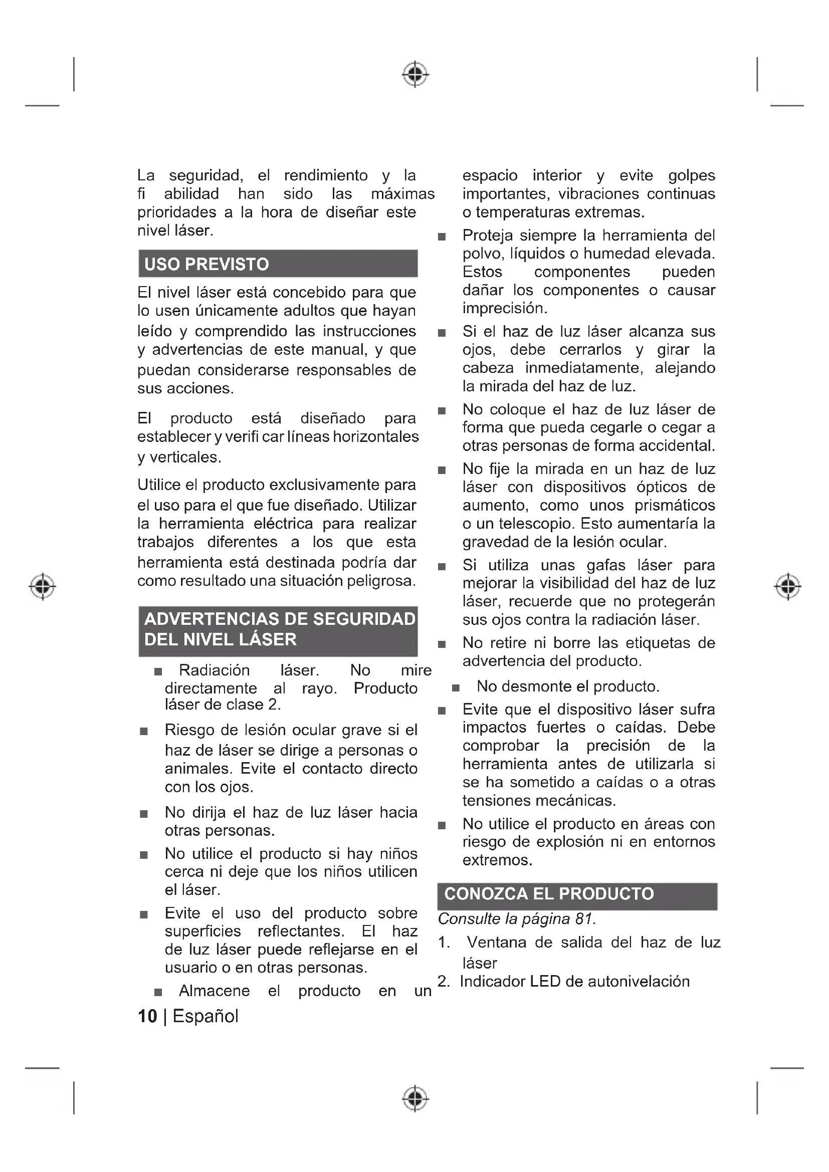 Ŷ Radiación láser. No mire directamente al rayo. Producto láser de clase 2. Ŷ Riesgo de lesión ocular grave si el haz de láser se dirige a personas o animales. Evite el contacto directo con los ojos. Ŷ No dirija el haz de luz láser hacia otras personas. Ŷ No utilice el producto si hay niños cerca ni deje que los niños utilicen el láser. Ŷ Evite el uso del producto sobre superficies reflectantes. El haz de luz láser puede reflejarse en el usuario o en otras personas. Ŷ Almacene el producto en un espacio interior y evite golpes importantes, vibraciones continuas o temperaturas extremas. Ŷ Proteja siempre la herramienta del polvo, líquidos o humedad elevada. Estos componentes pueden dañar los componentes o causar imprecisión. Ŷ Si el haz de luz láser alcanza sus ojos, debe cerrarlos y girar la cabeza inmediatamente, alejando la mirada del haz de luz. Ŷ No coloque el haz de luz láser de forma que pueda cegarle o cegar a otras personas de forma accidental. Ŷ No fije la mirada en un haz de luz láser con dispositivos ópticos de aumento, como unos prismáticos o un telescopio. Esto aumentaría la gravedad de la lesión ocular. Ŷ Si utiliza unas gafas láser para mejorar la visibilidad del haz de luz láser, recuerde que no protegerán sus ojos contra la radiación láser. Ŷ No retire ni borre las etiquetas de advertencia del producto. Ŷ No desmonte el producto. Ŷ Evite que el dispositivo láser sufra impactos fuertes o caídas. Debe comprobar la precisión de la herramienta antes de utilizarla si se ha sometido a caídas o a otras tensiones mecánicas. Ŷ No utilice el producto en áreas con riesgo de explosión ni en entornos extremos.