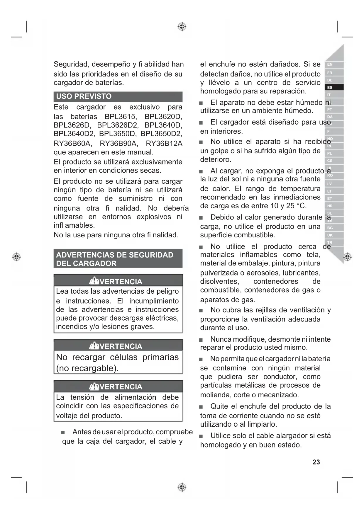 Seguridad, desempeño y fi abilidad han sido las prioridades en el diseño de su cargador de baterías. USO PREVISTO Este cargador es exclusivo para las baterías BPL3615, BPL3620D, BPL3626D, BPL3626D2, BPL3640D, BPL3640D2, BPL3650D, BPL3650D2, RY36B60A, RY36B90A, RY36B12A que aparecen en este manual. El producto se utilizará exclusivamente en interior en condiciones secas. El producto no se utilizará para cargar ningún tipo de batería ni se utilizará como fuente de suministro ni con ninguna otra fi nalidad. No debería utilizarse en entornos explosivos ni infl amables. No la use para ninguna otra fi nalidad.