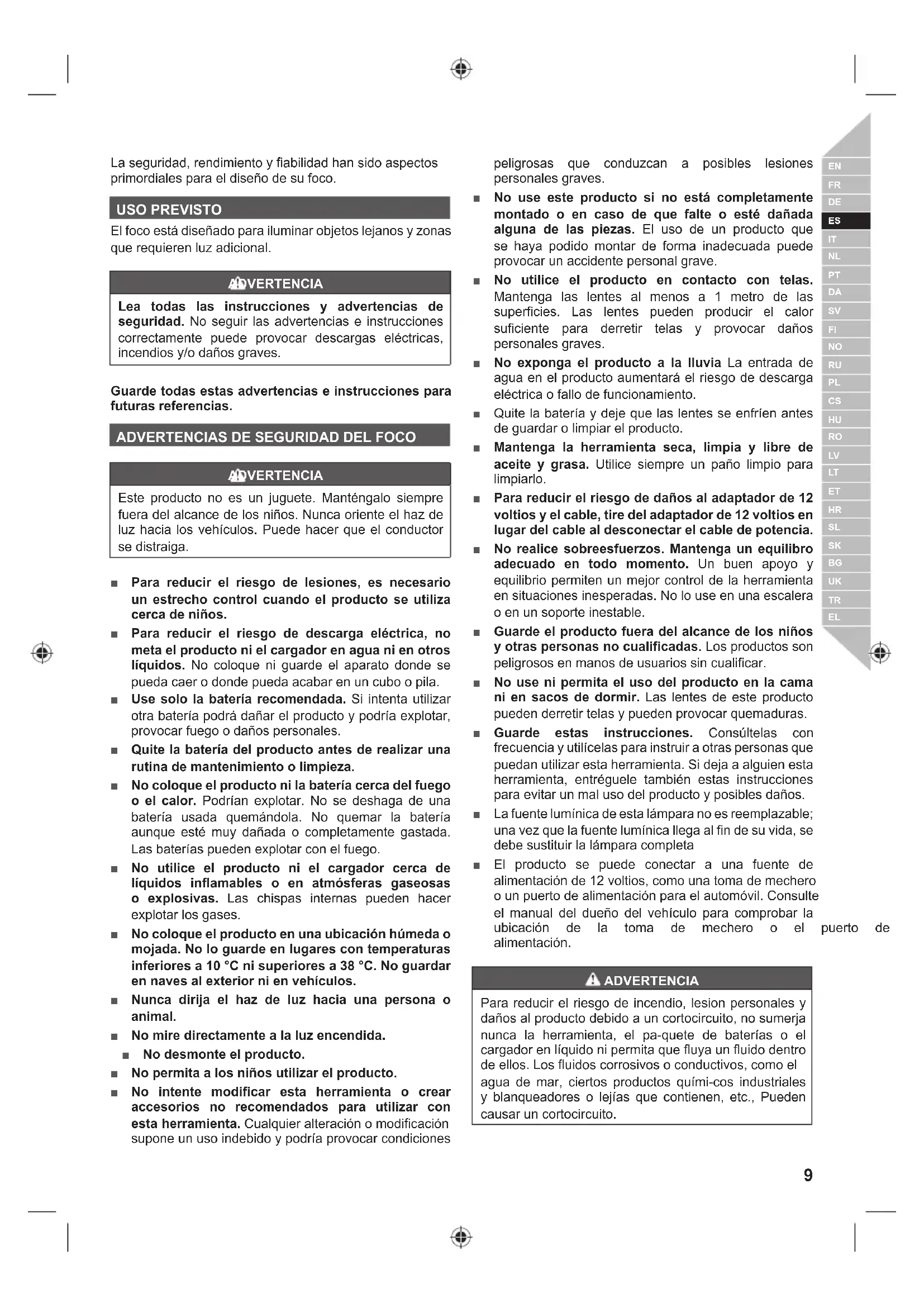ADVERTENCIA Este producto no es un juguete. Manténgalo siempre fuera del alcance de los niños. Nunca oriente el haz de luz hacia los vehículos. Puede hacer que el conductor se distraiga. Ŷ Para reducir el riesgo de lesiones, es necesario un estrecho control cuando el producto se utiliza cerca de niños. Ŷ Para reducir el riesgo de descarga eléctrica, no meta el producto ni el cargador en agua ni en otros líquidos. No coloque ni guarde el aparato donde se pueda caer o donde pueda acabar en un cubo o pila. Ŷ Use solo la batería recomendada. Si intenta utilizar otra batería podrá dañar el producto y podría explotar, provocar fuego o daños personales. Ŷ Quite la batería del producto antes de realizar una rutina de mantenimiento o limpieza. Ŷ No coloque el producto ni la batería cerca del fuego o el calor. Podrían explotar. No se deshaga de una batería usada quemándola. No quemar la batería aunque esté muy dañada o completamente gastada. Las baterías pueden explotar con el fuego. Ŷ No utilice el producto ni el cargador cerca de líquidos inflamables o en atmósferas gaseosas o explosivas. Las chispas internas pueden hacer explotar los gases. Ŷ No coloque el producto en una ubicación húmeda o mojada. No lo guarde en lugares con temperaturas inferiores a 10 °C ni superiores a 38 °C. No guardar en naves al exterior ni en vehículos. Ŷ Nunca dirija el haz de luz hacia una persona o animal. Ŷ No mire directamente a la luz encendida. Ŷ No desmonte el producto. Ŷ No permita a los niños utilizar el producto. Ŷ No intente modificar esta herramienta o crear accesorios no recomendados para utilizar con esta herramienta.&XDOTXLHUDOWHUDFLyQRPRGLILFDFLyQ supone un uso indebido y podría provocar condiciones peligrosas que conduzcan a posibles lesiones personales graves. Ŷ No use este producto si no está completamente montado o en caso de que falte o esté dañada alguna de las piezas. El uso de un producto que se haya podido montar de forma inadecuada puede provocar un accidente personal grave. Ŷ No utilice el producto en contacto con telas. Mantenga las lentes al menos a 1 metro de las superficies. Las lentes pueden producir el calor suficiente para derretir telas y provocar daños personales graves. Ŷ No exponga el producto a la lluvia La entrada de agua en el producto aumentará el riesgo de descarga eléctrica o fallo de funcionamiento. Ŷ Quite la batería y deje que las lentes se enfríen antes de guardar o limpiar el producto. Ŷ Mantenga la herramienta seca, limpia y libre de aceite y grasa. Utilice siempre un paño limpio para limpiarlo. Ŷ Para reducir el riesgo de daños al adaptador de 12 voltios y el cable, tire del adaptador de 12 voltios en lugar del cable al desconectar el cable de potencia. Ŷ No realice sobreesfuerzos. Mantenga un equilibro adecuado en todo momento. Un buen apoyo y equilibrio permiten un mejor control de la herramienta en situaciones inesperadas. No lo use en una escalera o en un soporte inestable. Ŷ Guarde el producto fuera del alcance de los niños y otras personas no cualificadas. Los productos son peligrosos en manos de usuarios sin cualificar. Ŷ No use ni permita el uso del producto en la cama ni en sacos de dormir. Las lentes de este producto pueden derretir telas y pueden provocar quemaduras. Ŷ Guarde estas instrucciones. &RQV~OWHODV FRQ frecuencia y utilícelas para instruir a otras personas que puedan utilizar esta herramienta. Si deja a alguien esta herramienta, entréguele también estas instrucciones para evitar un mal uso del producto y posibles daños. Ŷ La fuente lumínica de esta lámpara no es reemplazable; una vez que la fuente lumínica llega al fin de su vida, se debe sustituir la lámpara completa Ŷ El producto se puede conectar a una fuente de DOLPHQWDFLyQGHYROWLRVFRPRXQDWRPDGHPHFKHUR RXQSXHUWRGHDOLPHQWDFLyQSDUDHODXWRPyYLO&RQVXOWH el manual del dueño del vehículo para comprobar la XELFDFLyQ GH OD WRPD GH PHFKHUR R HO SXHUWR GH DOLPHQWDFLyQ ADVERTENCIA Para reducir el riesgo de incendio, lesion personales y daños al producto debido a un cortocircuito, no sumerja nunca la herramienta, el pa-quete de baterías o el FDUJDGRUHQOtTXLGRQLSHUPLWDTXHÀX\DXQÀXLGRGHQWUR