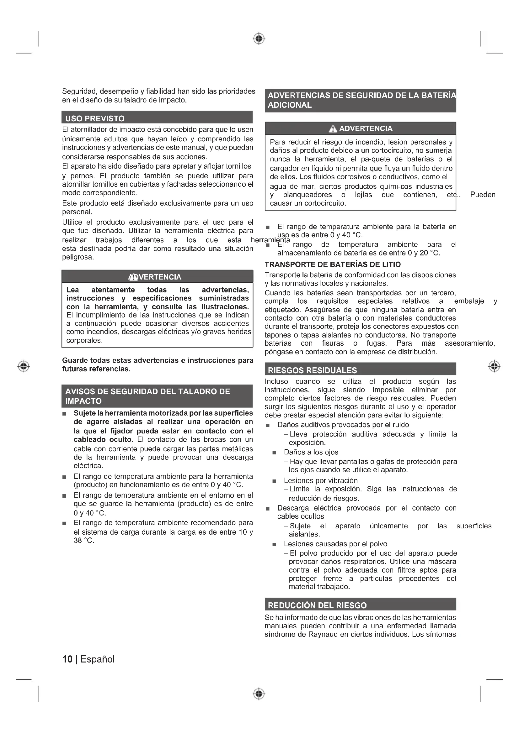 IMPACTO Ŷ Sujete la herramienta motorizada por las superficies de agarre aisladas al realizar una operación en la que el fijador pueda estar en contacto con el cableado oculto. El contacto de las brocas con un cable con corriente puede cargar las partes metálicas de la herramienta y puede provocar una descarga eléctrica. Ŷ El rango de temperatura ambiente para la herramienta (producto) en funcionamiento es de entre 0 y 40 °C. Ŷ El rango de temperatura ambiente en el entorno en el que se guarde la herramienta (producto) es de entre 0 y 40 °C. Ŷ El rango de temperatura ambiente recomendado para el sistema de carga durante la carga es de entre 10 y 38 °C. ADVERTENCIAS DE SEGURIDAD DE LA BATERÍA ADICIONAL ADVERTENCIA Para reducir el riesgo de incendio, lesion personales y GDxRVDOSURGXFWRGHELGRDXQFRUWRFLUFXLWRQRVXPHUMD nunca la herramienta, el pa-quete de baterías o el FDUJDGRUHQOtTXLGRQLSHUPLWDTXHÀX\DXQÀXLGRGHQWUR