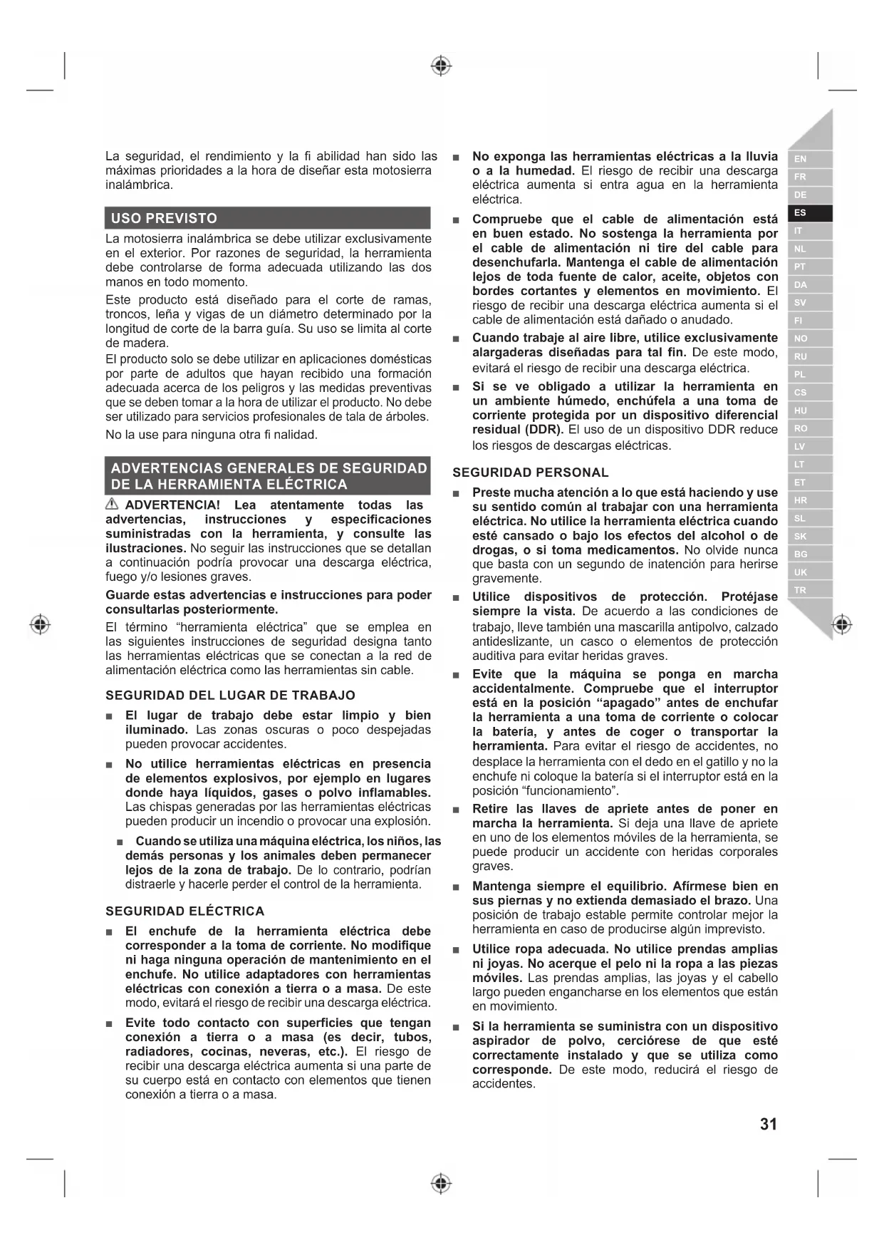 TR■ No corte con su cuerpo en línea con la barra de guía y la cadena. Si experimenta un rebote, esto evitará que la cadena entre en contacto con su cabeza o cuerpo. ■ No sierre desplazando la motosierra hacia delante y hacia atrás. Deje que la cadena realice el trabajo. Mantenga la cadena afilada y no intente ejercer presión sobre ella en la zona de corte. ■ No aplique presión sobre la sierra al final del corte. Prepárese para aguantar el peso de la sierra cuando ésta sobrepase la madera. De otro modo, podría sufrir lesiones personales graves. ■ No detenga la sierra en medio de una operación de corte. Mantenga la sierra funcionando hasta que ya esté retirada del corte. ■ Para reducir el riesgo de lesión asociado con el contacto con las piezas móviles, apague siempre el motor, accione el freno de la cadena, extraiga la batería y asegúrese de que todas las piezas móviles se hayan detenido por completo. ● antes de limpiar o despejar una obstrucción ● antes de dejar el producto sin vigilancia ● antes de colocar o quitar accesorios. ● antes de inspeccionar, mantener o trabajar con el producto ■ El uso prolongado de una herramienta puede causar o agravar lesiones. Al utilizar cualquier herramienta durante períodos prolongados asegúrese de tomar descansos regulares. ■ Si el aparato se cae, sufre un impacto fuerte o empieza a vibrar de manera anormal, párelo inmediatamente y compruebe si está dañado o identifique el motivo de la vibración. La reparación de daños y la sustitución de piezas deben ser realizadas por un centro de servicio autorizado. ■ Utilice el producto únicamente a temperaturas comprendidas entre 0 °C y 40 °C. ■ Guarde el producto en un lugar donde la temperatura ambiente esté comprendida entre -10 °C y 50 °C.