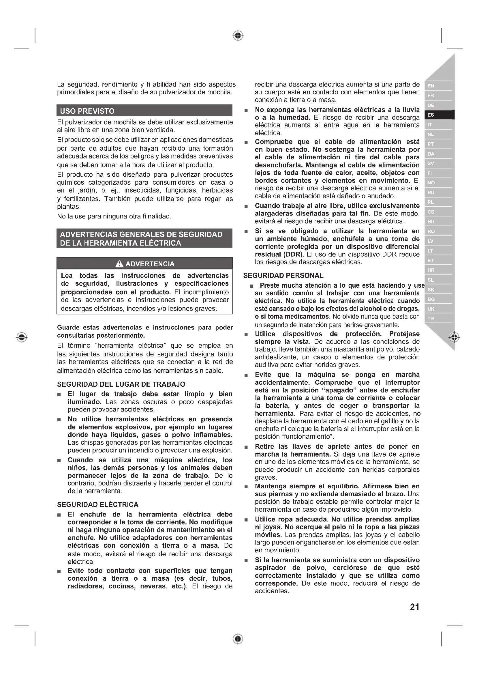 TR■ Asegúrese de que los materiales del espray se dirigen hacia una zona a la que dichos materiales no puedan dañar. ■ Puede sufrir descargas eléctricas. No pulverice en dirección a las tomas eléctricas. ■ Después de cada uso, lávese bien las manos y cualquier área de la piel que haya estado expuesta al espray. ■ Saque la batería del producto antes de drenar, limpiar o guardar para evitar un funcionamiento accidental. Indicación de que la maquinaria puede estar sujeta a los requisitos nacionales de inspección periódica por parte de los organismos designados, según se indica en la Directiva 2009/128/CE del Parlamento Europeo y del Consejo con fecha 21 de octubre de 2009, que establece el marco de acción comunitaria para lograr un uso sostenibles de los pesticidas. ADVERTENCIAS DE SEGURIDAD DE LA BATERÍA ADICIONAL ADVERTENCIA Para reducir el riesgo de incendio, lesion personales y daños al producto debido a un cortocircuito, no sumerja nunca la herramienta, el pa-quete de baterías o el cargador en líquido ni permita que fl uya un fl uido dentro de ellos. Los fl uidos corrosivos o conductivos, como el agua de mar, ciertos productos quími-cos industriales y blanqueadores o lejías que contienen, etc., Pueden causar un cortocircuito.