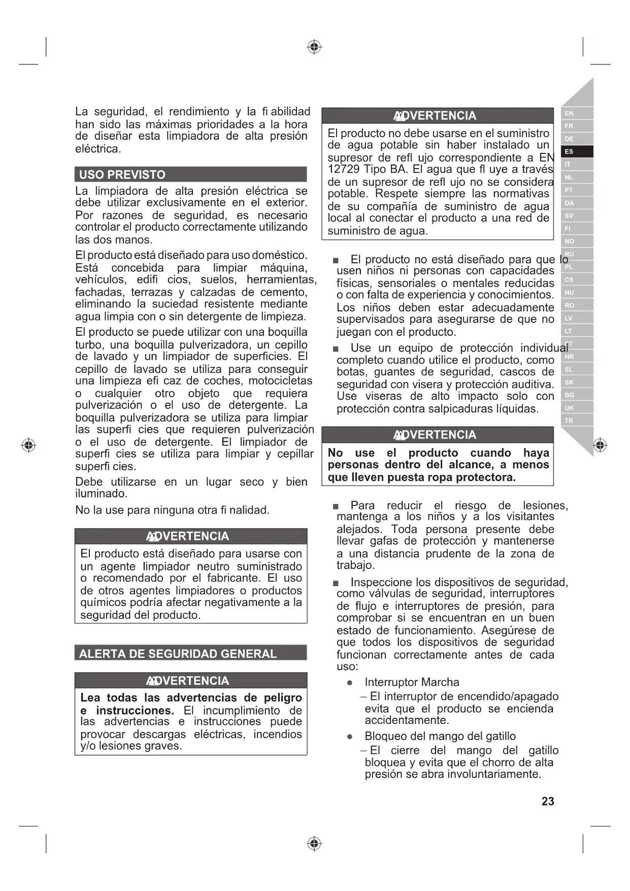 La seguridad, el rendimiento y la fi abilidad han sido las máximas prioridades a la hora de diseñar esta limpiadora de alta presión eléctrica. USO PREVISTO La limpiadora de alta presión eléctrica se debe utilizar exclusivamente en el exterior. Por razones de seguridad, es necesario controlar el producto correctamente utilizando las dos manos. El producto está diseñado para uso doméstico. Está concebida para limpiar máquina, vehículos, edifi cios, suelos, herramientas, fachadas, terrazas y calzadas de cemento, eliminando la suciedad resistente mediante agua limpia con o sin detergente de limpieza. El producto se puede utilizar con una boquilla turbo, una boquilla pulverizadora, un cepillo de lavado y un limpiador de superfi cies. El cepillo de lavado se utiliza para conseguir una limpieza efi caz de coches, motocicletas o cualquier otro objeto que requiera pulverización o el uso de detergente. La boquilla pulverizadora se utiliza para limpiar las superfi cies que requieren pulverización o el uso de detergente. El limpiador de superfi cies se utiliza para limpiar y cepillar superfi cies. Debe utilizarse en un lugar seco y bien iluminado. No la use para ninguna otra fi nalidad. ADVERTENCIA El producto está diseñado para usarse con un agente limpiador neutro suministrado o recomendado por el fabricante. El uso de otros agentes limpiadores o productos químicos podría afectar negativamente a la seguridad del producto.