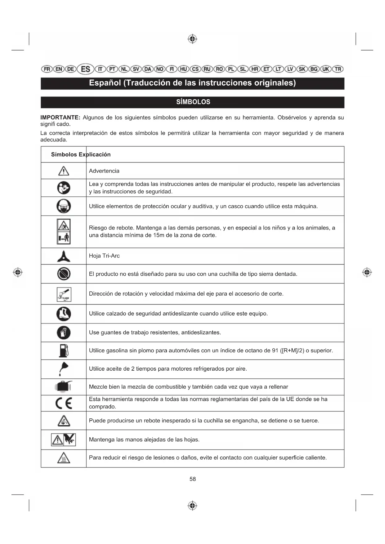 SI ESTAS SOLUCIONES NO RESUELVEN EL PROBLEMA PÓNGASE EN CONTACTO CON SU PROVEEDOR DE SERVICIO AUTORIZADO. Problema Causa posible Solución El motor no se enciende. No hay bujía. Puede que la bujía esté dañada; retírela y compruebe si hay suciedad o roturas. Sustituya con una nueva bujía. No hay combustible. Pulse el depósito del cebador hasta que esté lleno de combustible. Si el depósito no se llena, el sistema de suministro de combustible primario está bloqueado. Póngase en contacto con el servicio técnico autorizado. Si el depósito del cebador se llena, puede que el motor se desborde; siga con el siguiente elemento. El motor se ha ahogado. Extraiga la bujía, y encienda la unidad de manera que el orifi cio de la bujía apunte al suelo. Coloque la palanca del estrangulador en posición y tire de la palanca de arranque de 10 a 15 veces. Esta operación eliminará el exceso de combustible del motor. Retire todo el combustible del producto. Limpie y vuelva a colocar la bujía. Limpie cualquier derrame de combustible y sitúelo al menos a 9 m del motor antes de volver a encender el motor. Tire del encendido tres veces con la esfera del obturador en .Si el motor no arranca, ponga la palanca del estrangulador en posición y repita el procedimiento normal de arranque. Si el motor sigue sin arrancar, repita el procedimiento con una bujía nueva. Resulta más difícil tirar de la cuerda de arranque ahora que cuando era nueva. Póngase en contacto con el servicio técnico autorizado. Combustible usado. Utilice sólo combustible nuevo mezclado con el aceite recomendado. Un combustible con más de 30 días puede hacer que la unidad no arranque. El motor arranca pero no acelera correctamente. El motor tarda unos tres minutos en calentarse. Deje que el motor se caliente por completo. Si el motor no acelera transcurridos tres minutos, póngase en contacto con un distribuidor de servicio. El motor se enciende pero solo funciona a alta velocidad con el cebador en la posición intermedia. El carburador necesita un ajuste. Póngase en contacto con el servicio técnico autorizado.77 Español (Traducción de las instrucciones originales) El motor no alcanza la velocidad máxima y/o produce demasiado humo. Compruebe la mezcla de aceite y gasolina. Utilice una mezcla reciente de gasolina y aceite para motores de dos tiempos en la proporción correcta. El filtro de aire está sucio. Limpie el filtro de aire. Consulte la sección “Mantenimiento - Limpieza del filtro de aire” del manual. La pantalla apagachispas está sucia. Póngase en contacto con el servicio técnico autorizado. El motor arranca, funciona y acelera, pero no funciona en ralentí. Es necesario ajustar el tornillo de ralentí en el carburador. Póngase en contacto con el servicio técnico autorizado. La hoja sigue girando a ralentí. El carburador necesita un ajuste. Póngase en contacto con el servicio técnico autorizado. La línea no avanza. La línea se ha soldado. Lubrique con spray de silicona. No hay suficiente línea en la bobina. Instale más línea. Consulte la sección “Mantenimiento” del manual. La línea está muy gastada Tire de las líneas mientras presiona hacia abajo y suelta el cabezal de golpes de forma alternativa. La línea se ha enredado en la bobina. Retire la línea de la bobina y rebobine. Consulte la sección “Mantenimiento” del manual. La velocidad del motor es demasiado lenta. Avance la línea a toda potencia.78 Italiano (Traduzione dalle istruzioni originali) SIMBOLI IMPORTANTE: Alcuni dei seguenti simboli potranno essere utilizzati sul vostro utensile. Leggere i simboli e comprendere i loro signifi cati. Una corretta interpretazione di questi simboli consentirà all'operatore di utilizzare l'apparecchio con maggiore sicurezza e in modo adeguato. Simboli Spiegazione Avvertenza Leggere e comprendere tutte le istruzioni prima di mettere in funzione il prodotto, seguire tutte le istruzioni e le avvertenze di sicurezza. Durante l’uso dell’apparecchio, indossare protezioni oculari e uditive ed un casco. Pericolo di rimbalzo. Mantenere le persone estranee e, in particolar modo, i bambini e gli animali domestici ad una distanza di almeno 15m dall'area di lavoro. Lama Tri-Arc Il prodotto non è destinato all'uso con una lama di tipo sega dentata. Direzione rotazionale e velocità massima dell'albero per l'accessorio di taglio. Indossare calzature anti-scivolo con questo utensile. Indossare guanti anti-scivolo da lavoro. Utilizzare benzina senza piombo per autovetture con numero di ottano almeno pari a 91 ([R+M]/2). Utilizzare olio a 2 tempi per motori ad aria fredda. Mescolare il carburante completamente prima di ricaricare Questo apparecchio è conforme a tutte le norme vigenti nel paese dell'UE in cui è stato acquistato. La lama potrà rimbalzare senza avvertenze se scatta, si blocca o rimane impigliata. Tenere le mani lontane dalle lame. Per ridurre il rischio di lesioni o danni, evitare il contatto con superfici surriscaldatesi.79 Italiano (Traduzione dalle istruzioni originali) Posizione di corsa Posizionare la leva dell'aria sulla posizione “FULL” (Pieno). Posizionare la leva dell'aria sulla posizione “CHOKE”. Premere la pompetta 10 volte. Bloccare la leva a farfalla in posizione, premendo il tasto di blocco della leva a farfalla. Tempo di attesa 10 secondi