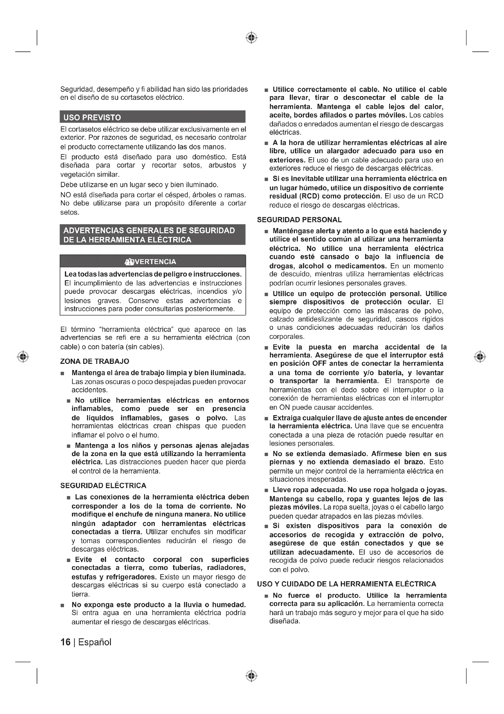 ■ Algunas regiones tienen normativas que restringen el uso del producto para algunas operaciones. Consulte con su autoridad local para obtener información. Lea todas las instrucciones. ■ Limpie el área de trabajo antes de cada uso. Retire todos los objetos, cables, luces, alambres o cadenas que puedan lanzar o engancharse en las partes cortantes. ■ Compruebe que no hay objetos extraños en el seto, como alambradas. ■ Tenga especial cuidado al usar el producto cerca de vallados, postes, edificios u otros objetos inamovibles. ■ Tenga cuidado con los objetos que caen. Las personas, niños y animales deberán estar a 15 metros del aparato como mínimo. ■ No permita que niños o individuos sin experiencia utilicen este producto. ■ No trabaje con esta herramienta en una zona mal iluminada. El operador debe tener una visión clara de la zona de trabajo para identificar peligros potenciales. ■ Asegúrese siempre de que todas las protecciones y mangos estén correctamente acoplados en el equipo. Nunca intente utilizar un producto incompleto o uno equipado con una modificación no autorizada. ■ Antes de cada uso, asegúrese de que todos los controles y dispositivos de seguridad funcionan correctamente. No utilice el aparato si el interruptor “off” no para el motor. ■ Inspeccione la máquina antes de cada uso. Revise si hay fijaciones sueltas. Asegúrese de que todas las protecciones y mangos están unidos de forma correcta y segura. Sustituya cualquier pieza damnificada antes de su utilización. ■ No modifique el producto en modo alguno. ■ Use gafas de protección total para los ojos y oídos al utilizar este producto. Si trabaja en un área donde existe un riesgo de caída de objetos, deberá utilizar casco. ■ Use guantes, botas y pantalones resistentes. No utilice ropa ancha, pantalones cortos, joyas ni lo utilice con los pies descalzos. ■ Recoja el cabello largo para que quede por encima del nivel de los hombros y evitar así que se enmarañe en cualquier pieza móvil. ■ El uso de dispositivos de protección auditiva reducirá su capacidad para oír posibles advertencias (gritos o alarmas). El operador debe prestar atención extra a lo que está sucediendo en el área de trabajo. ■ Utilizar herramientas similares a poca distancia18 | Español aumenta tanto el riesgo de lesión auditiva como el riesgo potencial de que otras personas accedan a su área de trabajo. ■ No utilice este producto si está cansado o si se encuentra bajo la influencia de drogas, alcohol o medicamentos. ■ Mantenga su pisada firme y su equilibrio. No se extienda demasiado. Un sobreesfuerzo puede dar lugar a la pérdida del equilibrio y a lesiones graves. ■ Mantenga las piezas en movimiento alejadas de su cuerpo. ■ Antes de arrancar la máquina, asegúrese de que las hojas de corte no entran en contacto con ningún objeto. ■ Cuando manipule un cortasetos, sujételo firmemente con ambas manos mediante los dos asas y asegúrese de que la posición de funcionamiento sea segura. El fabricante no recomienda el uso de escalones o escaleras. Si hay que recortar desde una posición más alta, utilice una herramienta de alcance extensible. ■ Las cuchillas son afiladas. Al utilizar el conjunto de cuchillas, utilice guantes de protección resistentes y antideslizantes. No coloque la mano o los dedos entre las cuchillas o en cualquier posición en la que pueda cortarse o pincharse. ■ Detenga siempre el producto, desconéctelo del suministro eléctrico, asegúrese de que todas las piezas móviles se han detenido y deje que el producto se enfríe antes de: ● ajuste de la posición de trabajo del dispositivo de corte ● limpieza y desobstrucción de bloqueo ● dejar el producto desatendido ● inspeccionar, mantener o trabajar con el producto ■ No fuerce el cortasetos al cortar zonas de arbustos duros. Esto puede hacer que las cuchillas se doblen y se ralenticen. Si las cuchillas se ralentizan, reduzca el ritmo de corte. ■ No intente cortar tallos o ramas de más de 22 mm de grosor, o los que, obviamente, sean demasiado grandes para la cuchilla de corte. Utilice una sierra de mano no motorizada o una sierra escamondadora para podar tallos largos. ■ No utilice la máquina con un dispositivo de corte dañado o excesivamente desgastado. ADVERTENCIA Si el aparato se cae, sufre un impacto fuerte o empieza a vibrar de manera anormal, párelo inmediatamente y compruebe si está dañado o identifique el motivo de la vibración. La reparación de daños y la sustitución de piezas deben ser realizadas por un centro de servicio autorizado. ■ El suministro eléctrico debería efectuarse mediante un dispositivo de corriente residual (RDC) con una corriente activa no superior a 30 mA. ■ Si necesita utilizar una extensión, compruebe que es adecuada en uso en el exterior y que tiene una capacidad de corriente suficiente para alimentar el aparato. Antes de cada uso compruebe que no hay daños. Mantenga siempre los cables desenrollados mientras los utiliza ya que los cables enrollados pueden sobrecalentarse. ■ Antes de cada uso, examine el cable para ver si está dañado. Caso existan señales de daños, este debe sustituirse por un técnico calificado en un centro de asistencia autorizado para evitar peligros.