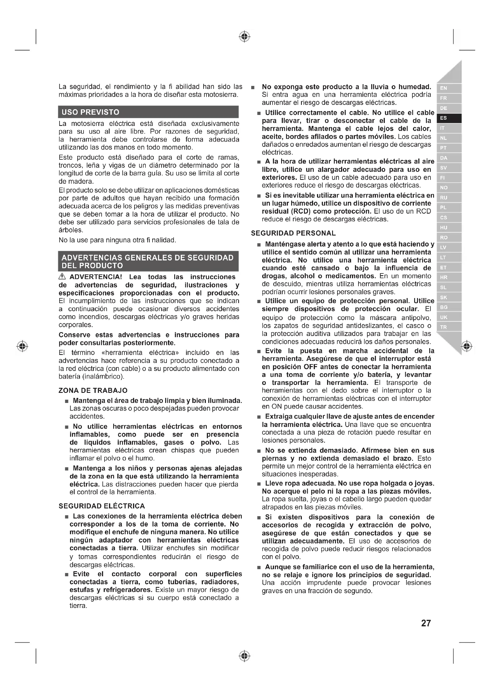 La seguridad, el rendimiento y la fi abilidad han sido las máximas prioridades a la hora de diseñar esta motosierra. USO PREVISTO La motosierra eléctrica está diseñada exclusivamente para su uso al aire libre. Por razones de seguridad, la herramienta debe controlarse de forma adecuada utilizando las dos manos en todo momento. Este producto está diseñado para el corte de ramas, troncos, leña y vigas de un diámetro determinado por la longitud de corte de la barra guía. Su uso se limita al corte de madera. El producto solo se debe utilizar en aplicaciones domésticas por parte de adultos que hayan recibido una formación adecuada acerca de los peligros y las medidas preventivas que se deben tomar a la hora de utilizar el producto. No debe ser utilizado para servicios profesionales de tala de árboles. No la use para ninguna otra fi nalidad.