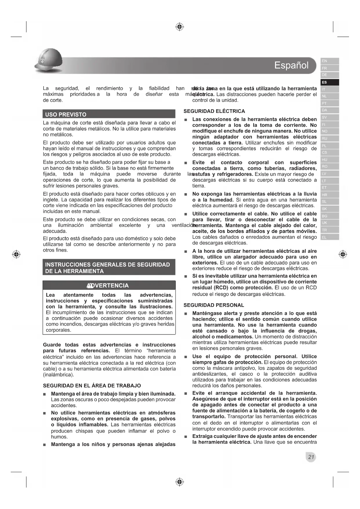 Ŷ Asegúrese de que el producto siempre se usa en una superficie estable y nivelada. Ŷ Utilice siempre protección ocular y auditiva cuando trabaje con este producto. Ŷ Utilice el equipo de protección individual, máscaras antipolvo, guantes y mandil. Ŷ 6LH[LVWHHOULHVJRGHTXHFDLJDDOJ~QREMHWRSyQJDVH un casco o protección para la cabeza. Ŷ Asegúrese de que la rueda de corte abrasiva esta correctamente instalada y apretada antes de usarla, arranque el aparato sin carga durante 30 segundosEspañol