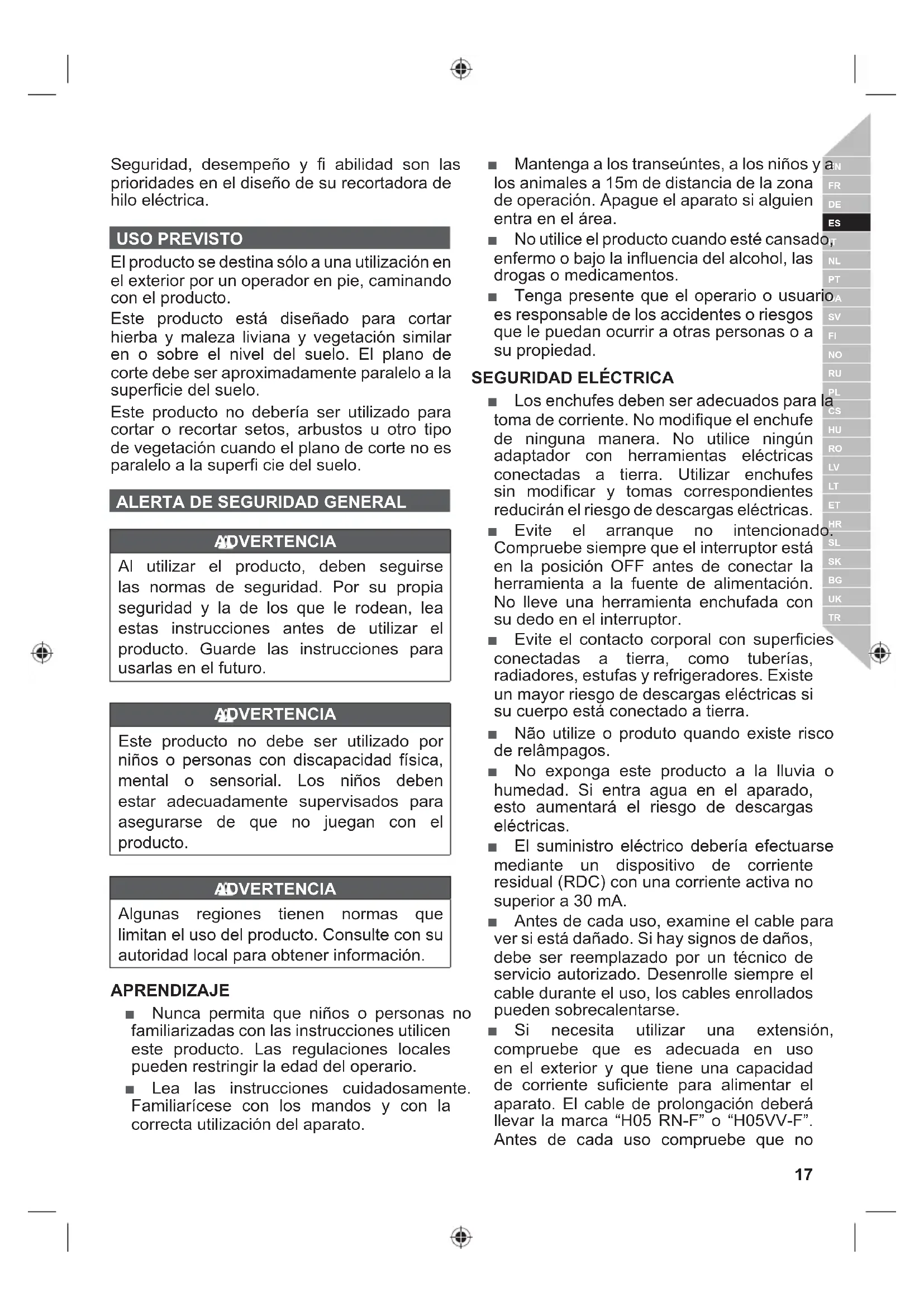 ADVERTENCIA Al utilizar el producto, deben seguirse las normas de seguridad. Por su propia seguridad y la de los que le rodean, lea estas instrucciones antes de utilizar el producto. Guarde las instrucciones para usarlas en el futuro. ADVERTENCIA Este producto no debe ser utilizado por niños o personas con discapacidad física, mental o sensorial. Los niños deben estar adecuadamente supervisados para asegurarse de que no juegan con el producto. ADVERTENCIA Algunas regiones tienen normas que limitan el uso del producto. Consulte con su autoridad local para obtener información. APRENDIZAJE Ŷ Nunca permita que niños o personas no familiarizadas con las instrucciones utilicen este producto. Las regulaciones locales pueden restringir la edad del operario. Ŷ Lea las instrucciones cuidadosamente. Familiarícese con los mandos y con la correcta utilización del aparato. Ŷ Mantenga a los transeúntes, a los niños y a los animales a 15m de distancia de la zona de operación. Apague el aparato si alguien entra en el área. Ŷ No utilice el producto cuando esté cansado, enfermo o bajo la influencia del alcohol, las drogas o medicamentos. Ŷ Tenga presente que el operario o usuario es responsable de los accidentes o riesgos que le puedan ocurrir a otras personas o a su propiedad.
