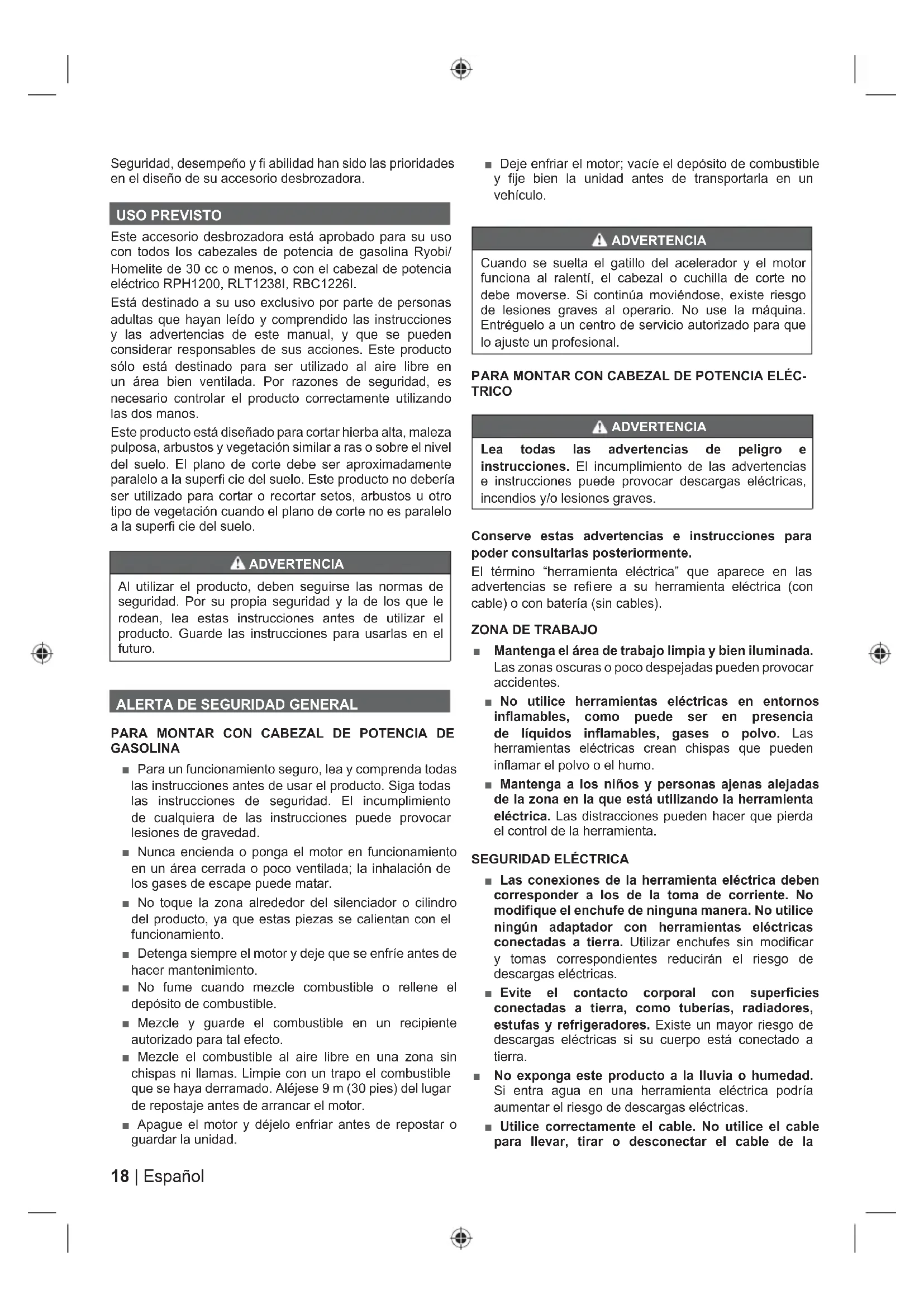 PARA MONTAR CON CABEZAL DE POTENCIA DE GASOLINA ■ Para un funcionamiento seguro, lea y comprenda todas las instrucciones antes de usar el producto. Siga todas las instrucciones de seguridad. El incumplimiento de cualquiera de las instrucciones puede provocar lesiones de gravedad. ■ Nunca encienda o ponga el motor en funcionamiento en un área cerrada o poco ventilada; la inhalación de los gases de escape puede matar. ■ No toque la zona alrededor del silenciador o cilindro del producto, ya que estas piezas se calientan con el funcionamiento. ■ Detenga siempre el motor y deje que se enfríe antes de hacer mantenimiento. ■ No fume cuando mezcle combustible o rellene el depósito de combustible. ■ Mezcle y guarde el combustible en un recipiente autorizado para tal efecto. ■ Mezcle el combustible al aire libre en una zona sin chispas ni llamas. Limpie con un trapo el combustible que se haya derramado. Aléjese 9 m (30 pies) del lugar de repostaje antes de arrancar el motor. ■ Apague el motor y déjelo enfriar antes de repostar o guardar la unidad. ■ Deje enfriar el motor; vacíe el depósito de combustible y fije bien la unidad antes de transportarla en un vehículo. ADVERTENCIA Cuando se suelta el gatillo del acelerador y el motor funciona al ralentí, el cabezal o cuchilla de corte no debe moverse. Si continúa moviéndose, existe riesgo de lesiones graves al operario. No use la máquina. Entréguelo a un centro de servicio autorizado para que lo ajuste un profesional.