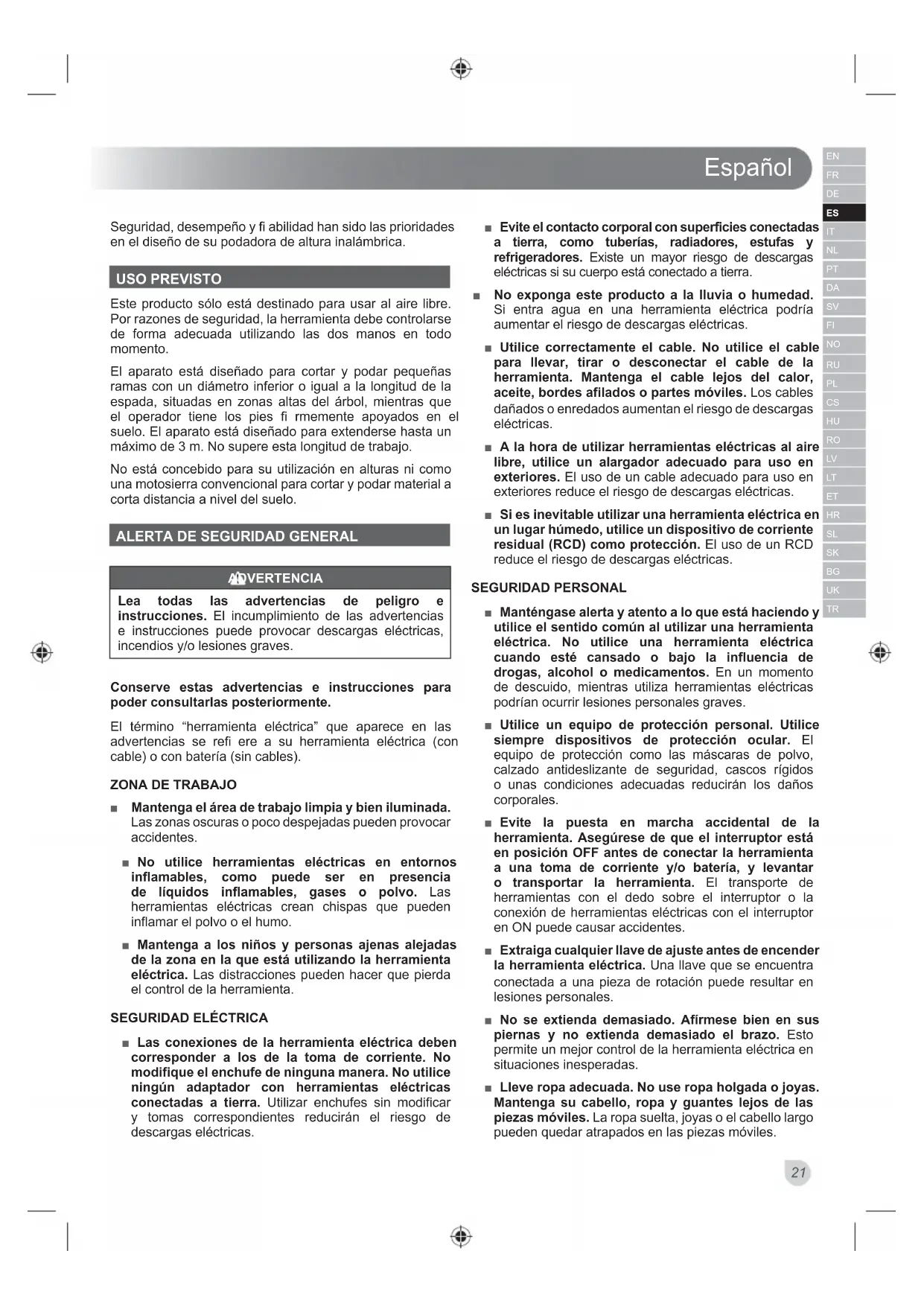 Protección auditiva – debe cumplir la norma EN 352-1 y poseer el marcado CE Protección ocular y para el rostro – deben poseer el marcado CE y cumplir la norma EN 166 (para gafas de seguridad) o EN 1731 (para pantallas de rejilla) Guantes – debe cumplir la norma EN 381-7 y poseer el marcado CE Calzado – debe cumplir la norma EN 20345 y poseer el marcado CE ADVERTENCIAS DE SEGURIDAD DE LA BATERÍA ADICIONAL ADVERTENCIA Para reducir el riesgo de incendio, lesion personales y daños al producto debido a un cortocircuito, no sumerja nunca la herramienta, el pa-quete de baterías o el cargador en líquido ni permita que fl uya un fl uido dentro de ellos. Los fl uidos corrosivos o conductivos, como el agua de mar, ciertos productos quími-cos industriales y blanqueadores o lejías que contienen, etc., Pueden causar un cortocircuito. UTILIZACIÓN ■ Estudie las condiciones del árbol y de las ramas antes de empezar a trabajar. Si existen signos de daño, putrefacción o degradación, no intente podar solo. Las ramas dañadas o podridas son sumamente inestables. Busque los servicios de un arboricultor profesional. ■ Nunca se pare debajo de la rama ser podados. ■ Ramas podadas no siempre caen limpiamente al suelo. Pueden engancharse o desviarse debido a otro follaje. Mientras poda, asegúrese de respetar y mantener un área de seguridad que mida al menos el doble de la longitud de la rama que va a cortar. Si esto no es posible, busque los servicios de un arboricultor. ■ Asegúrese de que la rama que va a caer no supone un peligro ni para usted ni para los transeúntes o los bienes, incluidos los cables.Español