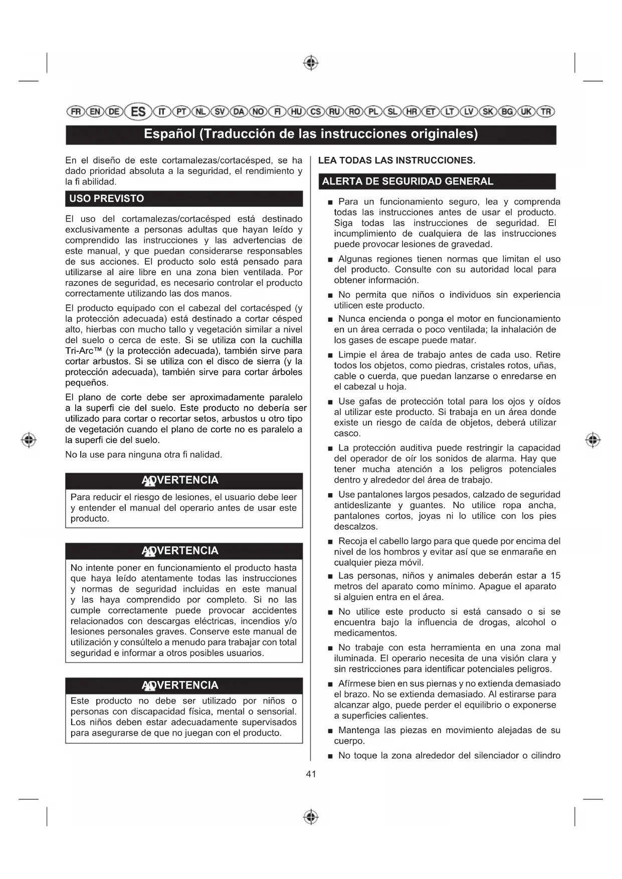 WARNUNG Ein undichter Tankdeckel stellt eine Feuergefahr dar und muss unverzüglich ersetzt werden! Der Tankdeckel enthält einen wartungsfreien Filter und ein Rückschlagventil. Ein verstopfter Treibstofffi lter führt zu einer verschlechterten Motorleistung. Falls die Leistung sich verbessert, wenn der Tankdeckel gelöst wird, kann das Rückschlagventil defekt oder der Filter verstopft sein. Ersetzen Sie falls erforderlich den Tankdeckel. ZÜNDKERZE In diesem Motor wird eine Zündkerze des Typs L8RTF/ NHSP LD oder L8RTF/BOSCH oder gleichwertig mit einer Elektrodenabstand von 0,5 mm verwendet. Benutzen Sie einen genauen Ersatz. VORSICHT Achten Sie darauf, die Zündkerze nicht verkantet einzuschrauben. Durch Verschneiden wird der Motor schwer beschädigt.41 Español (Traducción de las instrucciones originales) En el diseño de este cortamalezas/cortacésped, se ha dado prioridad absoluta a la seguridad, el rendimiento y la fi abilidad. USO PREVISTO El uso del cortamalezas/cortacésped está destinado exclusivamente a personas adultas que hayan leído y comprendido las instrucciones y las advertencias de este manual, y que puedan considerarse responsables de sus acciones. El producto solo está pensado para utilizarse al aire libre en una zona bien ventilada. Por razones de seguridad, es necesario controlar el producto correctamente utilizando las dos manos. El producto equipado con el cabezal del cortacésped (y la protección adecuada) está destinado a cortar césped alto, hierbas con mucho tallo y vegetación similar a nivel del suelo o cerca de este. Si se utiliza con la cuchilla Tri-Arc™ (y la protección adecuada), también sirve para cortar arbustos. Si se utiliza con el disco de sierra (y la protección adecuada), también sirve para cortar árboles pequeños. El plano de corte debe ser aproximadamente paralelo a la superfi cie del suelo. Este producto no debería ser utilizado para cortar o recortar setos, arbustos u otro tipo de vegetación cuando el plano de corte no es paralelo a la superfi cie del suelo. No la use para ninguna otra fi nalidad. ADVERTENCIA Para reducir el riesgo de lesiones, el usuario debe leer y entender el manual del operario antes de usar este producto. ADVERTENCIA No intente poner en funcionamiento el producto hasta que haya leído atentamente todas las instrucciones y normas de seguridad incluidas en este manual y las haya comprendido por completo. Si no las cumple correctamente puede provocar accidentes relacionados con descargas eléctricas, incendios y/o lesiones personales graves. Conserve este manual de utilización y consúltelo a menudo para trabajar con total seguridad e informar a otros posibles usuarios. ADVERTENCIA Este producto no debe ser utilizado por niños o personas con discapacidad física, mental o sensorial. Los niños deben estar adecuadamente supervisados para asegurarse de que no juegan con el producto. LEA TODAS LAS INSTRUCCIONES.