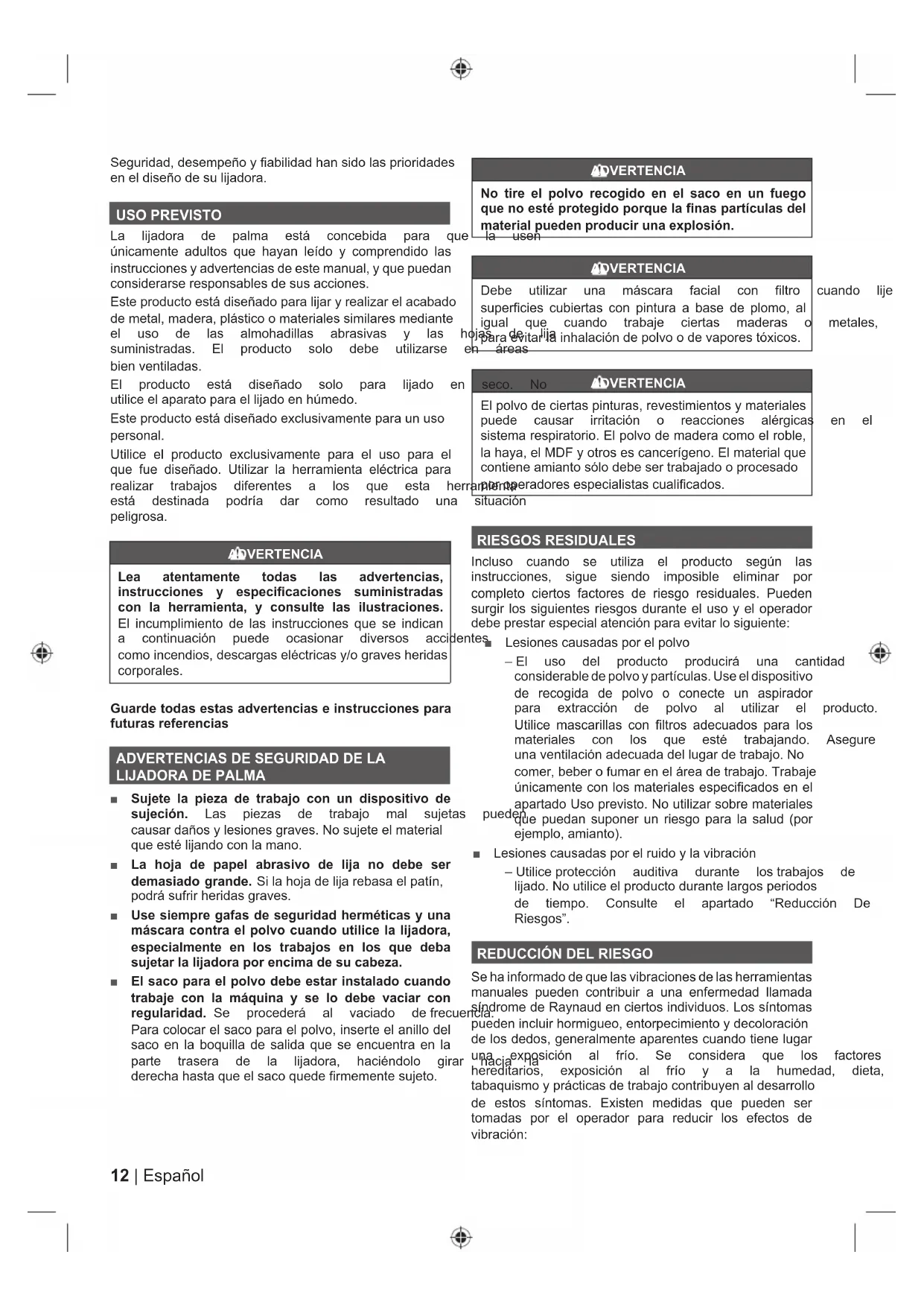 Ŷ Sujete la pieza de trabajo con un dispositivo de sujeción. /DV SLH]DV GH WUDEDMR PDO VXMHWDV SXHGHQ FDXVDUGDxRV\OHVLRQHVJUDYHV1RVXMHWHHOPDWHULDO TXHHVWpOLMDQGRFRQODPDQR Ŷ La hoja de papel abrasivo de lija no debe ser demasiado grande. 6LODKRMDGHOLMDUHEDVDHOSDWtQ SRGUiVXIULUKHULGDVJUDYHV Ŷ Use siempre gafas de seguridad herméticas y una máscara contra el polvo cuando utilice la lijadora, especialmente en los trabajos en los que deba sujetar la lijadora por encima de su cabeza. Ŷ El saco para el polvo debe estar instalado cuando trabaje con la máquina y se lo debe vaciar con regularidad. 6H SURFHGHUi DO YDFLDGR GHIUHFXHQFLD Para colocar el saco para el polvo, inserte el anillo del saco en la boquilla de salida que se encuentra en la SDUWH WUDVHUD GH OD OLMDGRUD KDFLpQGROR JLUDU KDFLD OD GHUHFKDKDVWDTXHHOVDFRTXHGHILUPHPHQWHVXMHWR ADVERTENCIA No tire el polvo recogido en el saco en un fuego que no esté protegido porque la finas partículas del material pueden producir una explosión. ADVERTENCIA 'HEH XWLOL]DU XQD PiVFDUD IDFLDO FRQ ILOWUR FXDQGR OLMH superficies cubiertas con pintura a base de plomo, al LJXDO TXH FXDQGR WUDEDMH FLHUWDV PDGHUDV R PHWDOHV SDUDHYLWDUODLQKDODFLyQGHSROYRRGHYDSRUHVWy[LFRV ADVERTENCIA El polvo de ciertas pinturas, revestimientos y materiales SXHGH FDXVDU LUULWDFLyQ R UHDFFLRQHV DOpUJLFDV HQ HO sistema respiratorio. El polvo de madera como el roble, la haya, el MDF y otros es cancerígeno. El material que FRQWLHQHDPLDQWRVyORGHEHVHUWUDEDMDGRRSURFHVDGR por operadores especialistas cualificados. RIESGOS RESIDUALES Incluso cuando se utiliza el producto según las instrucciones, sigue siendo imposible eliminar por completo ciertos factores de riesgo residuales. Pueden surgir los siguientes riesgos durante el uso y el operador GHEHSUHVWDUHVSHFLDODWHQFLyQSDUDHYLWDUORVLJXLHQWH Ŷ Lesiones causadas por el polvo – (O XVR GHO SURGXFWR SURGXFLUi XQD FDQWLGDG considerable de polvo y partículas. Use el dispositivo de recogida de polvo o conecte un aspirador SDUD H[WUDFFLyQ GH SROYR DO XWLOL]DU HO SURGXFWR Utilice mascarillas con filtros adecuados para los PDWHULDOHV FRQ ORV TXH HVWp WUDEDMDQGR $VHJXUH XQDYHQWLODFLyQDGHFXDGDGHOOXJDUGHWUDEDMR1R FRPHUEHEHURIXPDUHQHOiUHDGHWUDEDMR7UDEDMH únicamente con los materiales especificados en el apartado Uso previsto. No utilizar sobre materiales que puedan suponer un riesgo para la salud (por HMHPSORDPLDQWR Ŷ /HVLRQHVFDXVDGDVSRUHOUXLGR\ODYLEUDFLyQ – 8WLOLFHSURWHFFLyQ DXGLWLYD GXUDQWH ORVWUDEDMRV GH OLMDGR1RXWLOLFHHOSURGXFWRGXUDQWHODUJRVSHULRGRV GH WLHPSR &RQVXOWH HO DSDUWDGR ³5HGXFFLyQ 'H Riesgos”.