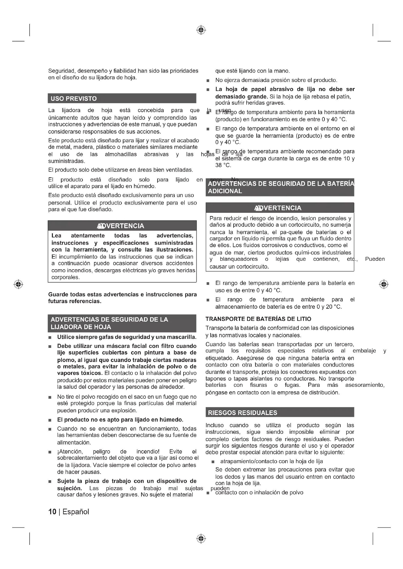 Transporte la batería de conformidad con las disposiciones y las normativas locales y nacionales. Cuando las baterías sean transportadas por un tercero, FXPSOD ORV UHTXLVLWRV HVSHFLDOHV UHODWLYRV DO HPEDODMH \ etiquetado. Asegúrese de que ninguna batería entra en contacto con otra batería o con materiales conductores GXUDQWHHOWUDQVSRUWHSURWHMDORVFRQHFWRUHVH[SXHVWRVFRQ tapones o tapas aislantes no conductoras. No transporte EDWHUtDV FRQ ¿VXUDV R IXJDV 3DUD PiV DVHVRUDPLHQWR póngase en contacto con la empresa de distribución. RIESGOS RESIDUALES Incluso cuando se utiliza el producto según las instrucciones, sigue siendo imposible eliminar por completo ciertos factores de riesgo residuales. Pueden surgir los siguientes riesgos durante el uso y el operador debe prestar especial atención para evitar lo siguiente: Ŷ DWUDSDPLHQWRFRQWDFWRFRQODKRMDGHOLMD Se deben extremar las precauciones para evitar que los dedos y las manos del usuario entren en contacto FRQODKRMDGHOLMD Ŷ contacto con o inhalación de polvo 10 | Español0LHQWUDV VH XWLOL]D HO SURGXFWR VH SURGXFLUiQ considerables cantidades de polco y partículas finas. Use el dispositivo de recogida de polvo al utilizar el producto. Use mascarillas protectoras con filtros adecuados para los materiales con los que va a WUDEDMDU$VHJXUHXQDYHQWLODFLyQDGHFXDGDGHOOXJDUGH WUDEDMR1RFRPHUEHEHURIXPDUHQHOiUHDGHWUDEDMR Ŷ riesgo de explosión El polvo acumulado puede arder y provocar incendios.