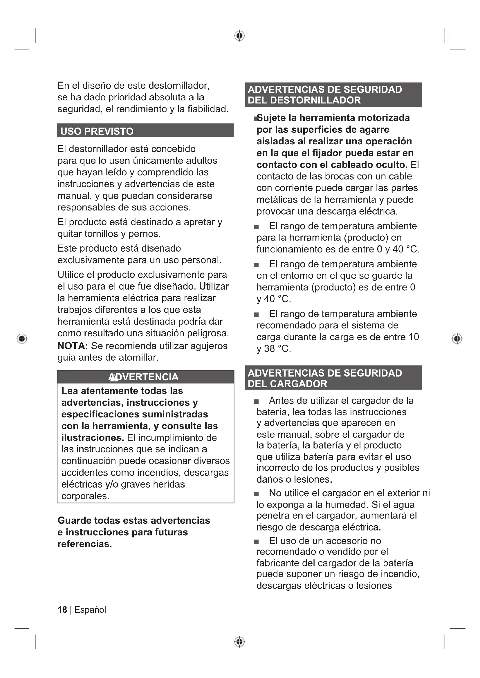 Sujete la herramienta motorizada por las superficies de agarre aisladas al realizar una operación en la que el fijador pueda estar en contacto con el cableado oculto. El contacto de las brocas con un cable con corriente puede cargar las partes metálicas de la herramienta y puede provocar una descarga eléctrica. Ŷ El rango de temperatura ambiente para la herramienta (producto) en funcionamiento es de entre 0 y 40 °C. Ŷ El rango de temperatura ambiente en el entorno en el que se guarde la herramienta (producto) es de entre 0 y 40 °C. Ŷ El rango de temperatura ambiente recomendado para el sistema de carga durante la carga es de entre 10 y 38 °C.