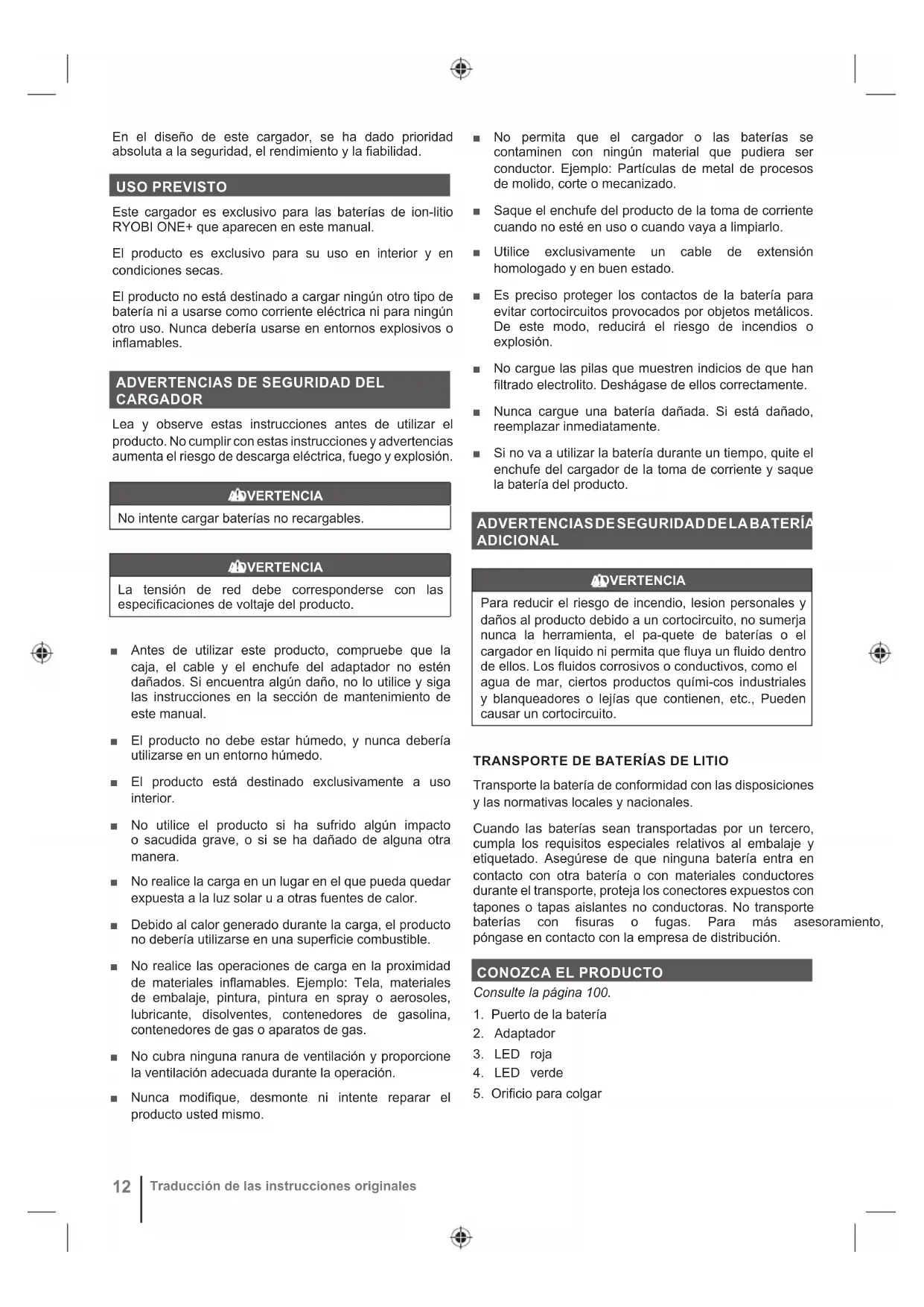 USO PREVISTO Este cargador es exclusivo para las baterías de ion-litio RYOBI ONE+ que aparecen en este manual. El producto es exclusivo para su uso en interior y en condiciones secas. El producto no está destinado a cargar ningún otro tipo de batería ni a usarse como corriente eléctrica ni para ningún otro uso. Nunca debería usarse en entornos explosivos o LQÀDPDEOHV