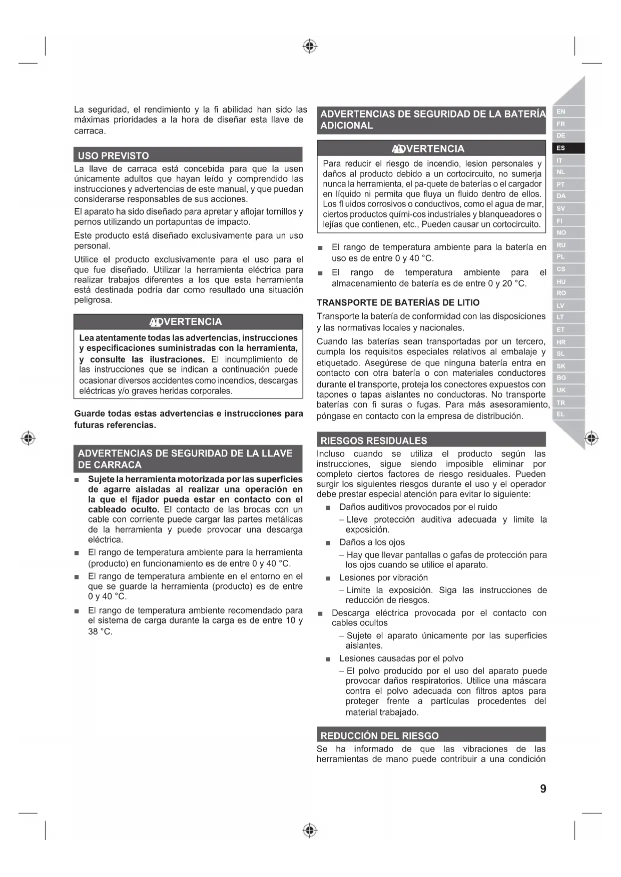 DE CARRACA ■ Sujete la herramienta motorizada por las superficies de agarre aisladas al realizar una operación en la que el fijador pueda estar en contacto con el cableado oculto. El contacto de las brocas con un cable con corriente puede cargar las partes metálicas de la herramienta y puede provocar una descarga eléctrica. ■ El rango de temperatura ambiente para la herramienta (producto) en funcionamiento es de entre 0 y 40 °C. ■ El rango de temperatura ambiente en el entorno en el que se guarde la herramienta (producto) es de entre 0 y 40 °C. ■ El rango de temperatura ambiente recomendado para el sistema de carga durante la carga es de entre 10 y 38 °C. ADVERTENCIAS DE SEGURIDAD DE LA BATERÍA ADICIONAL ADVERTENCIA Para reducir el riesgo de incendio, lesion personales y daños al producto debido a un cortocircuito, no sumerja nunca la herramienta, el pa-quete de baterías o el cargador en líquido ni permita que fl uya un fl uido dentro de ellos. Los fl uidos corrosivos o conductivos, como el agua de mar, ciertos productos quími-cos industriales y blanqueadores o lejías que contienen, etc., Pueden causar un cortocircuito. ■ El rango de temperatura ambiente para la batería en uso es de entre 0 y 40 °C. ■ El rango de temperatura ambiente para el almacenamiento de batería es de entre 0 y 20 °C.
