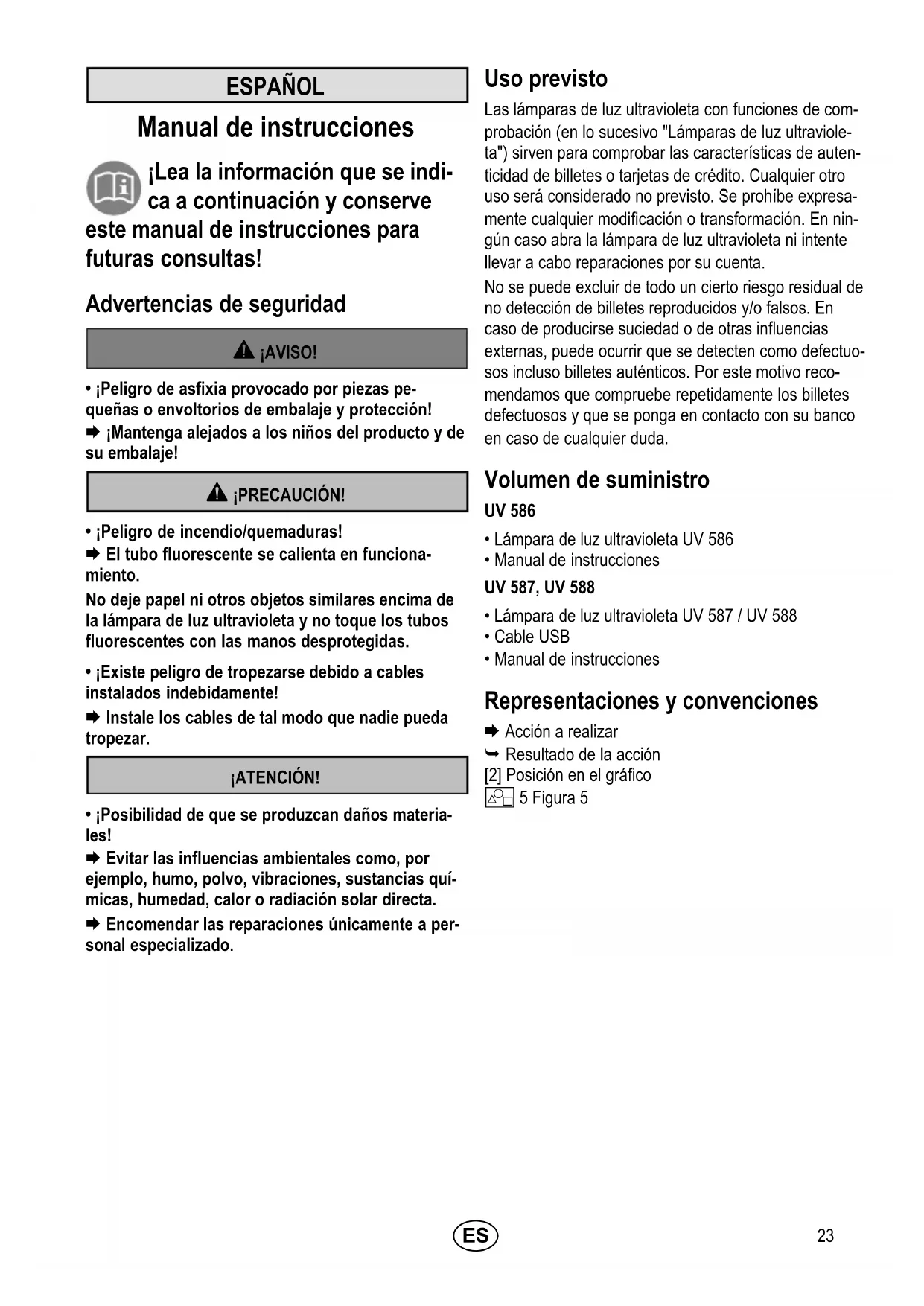 - ¡Posibilidad de que se produzcan daños materia les! Evitar las influencias ambientales como, por ejemplo, humo, polvo, vibraciones, sustancias quí micas, humedad, calor o radiación solar directa. Encomendar las reparaciones únicamente a per sonal especializado. Uso previsto Las lámparas de luz ultravioleta con funciones de com probación (en lo sucesivo "Lámparas de luz ultraviole ta") sirven para comprobar las características de auten ticidad de billetes o tarjetas de crédito. Cualquier otro uso será considerado no previsto. Se prohíbe expresa mente cualquier modificación o transformación. En nin gún caso abra la lámpara de luz ultravioleta ni intente llevar a cabo reparaciones por su cuenta. No se puede excluir de todo un cierto riesgo residual de no detección de billetes reproducidos y/o falsos. En caso de producirse suciedad o de otras influencias externas, puede ocurrir que se detecten como defectuo sos incluso billetes auténticos. Por este motivo reco mendamos que compruebe repetidamente los billetes defectuosos y que se ponga en contacto con su banco en caso de cualquier duda. Volumen de suministro UV 586